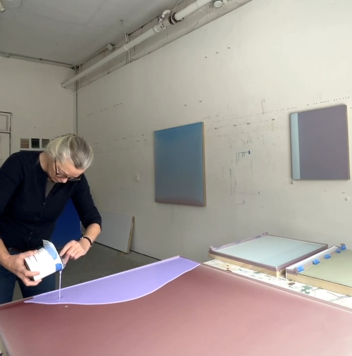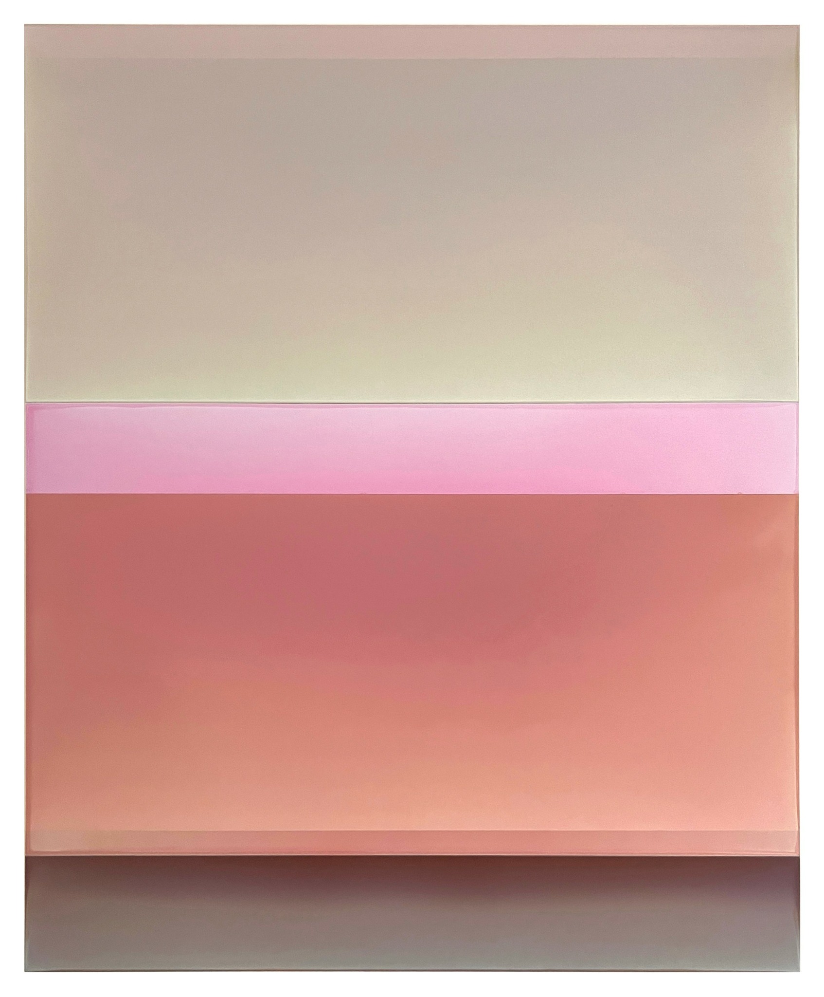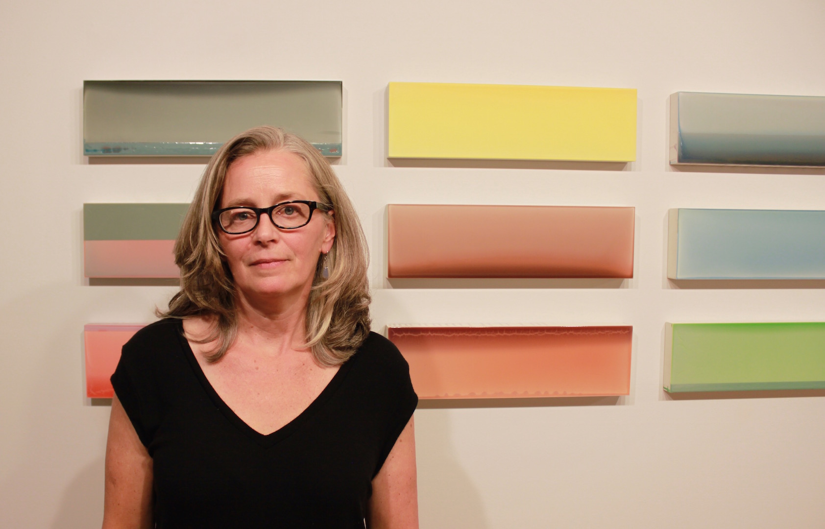 My abstract work is about color, light and surface and is inspired by my relationship to landscape. Over the past 15 years, I have developed a process of pouring layers of tinted polymer on panel that has expanded the breadth of what I can achieve with color and surface. After pouring the tinted polymer, I manipulate the panel so the paint collects or cracks. I do multiple transparent or semi opaque layers which create a depth and complexity to the color. The poured polymer mimics nature: a layer of polymer hardens like ice or mud —its thickness and viscosity impacting how the surface dries. The variations on the surface and the quality of the color are the result of a delicate and flexible relationship between control and accident. I assemble the poured panels into specifically calibrated horizontal or vertical sequences, creating a narrative of color, space, and light. The surfaces range from dull to glossy, either absorbing or reflecting the light, existing always in relationship to the light in the room and the position of the viewer.