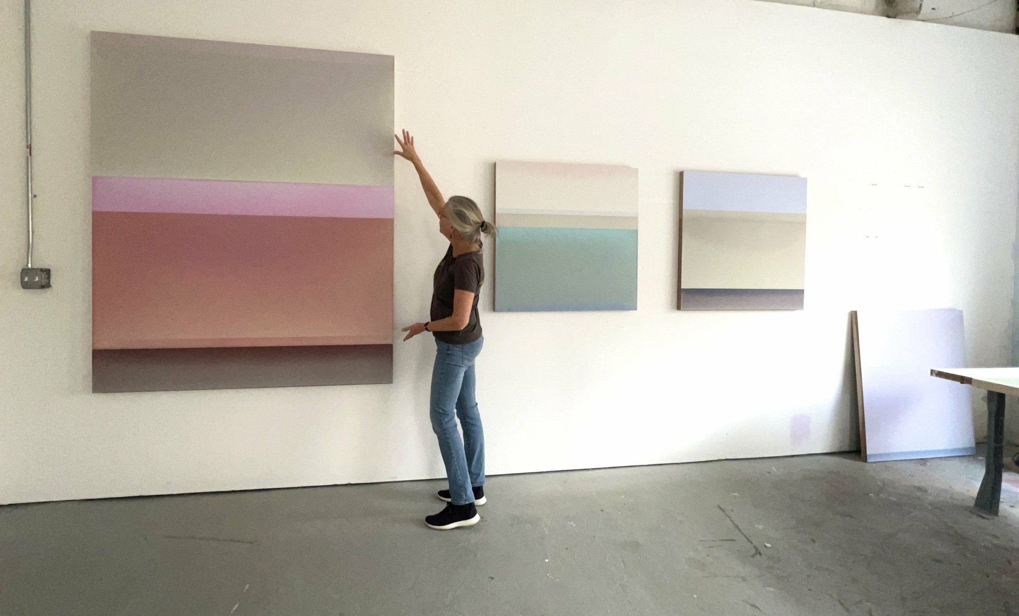 The most frequent comment I get about my work is that it is calm. I understand the comment, but it surprises me because I’m not a particularly calm person and I think people might jump to a conclusion that I am in a serene or zen state while making the work. I do have my zen moments, but there is plenty of struggle and frustration in my studio as well. I am always trying to push the work, make the best work I can and to continue to evolve and develop as an artist. The paintings have a tautness to them and a darker resonance that might not be immediately apparent. The color relationships are very specific and hard won, it can be hard work to get there!