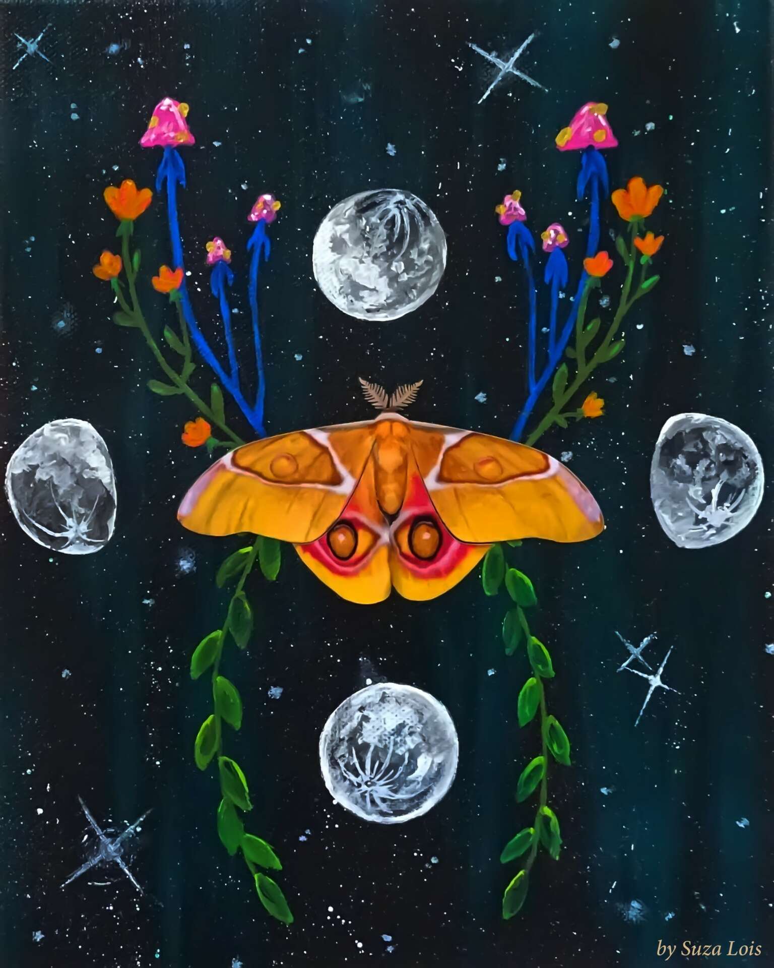 Palefoxredarts is what I call my art influence ( my artistic name.) I understand it’s a bit of a mouthful, but I’ve always thought of it as a play with old folk tales and stories. Something you would use in a nursery rhyme or sing as you skip down the sidewalk as a kid. Mainly, for myself, it embodies a fairy tale/ magical world I want to instill and create with my work. I like to use a bit of all mediums in my work, but mostly I paint, use collage mediums and mainly focus on nature with some added ‘spice’ thrown in with dreamy and outer world imagery.