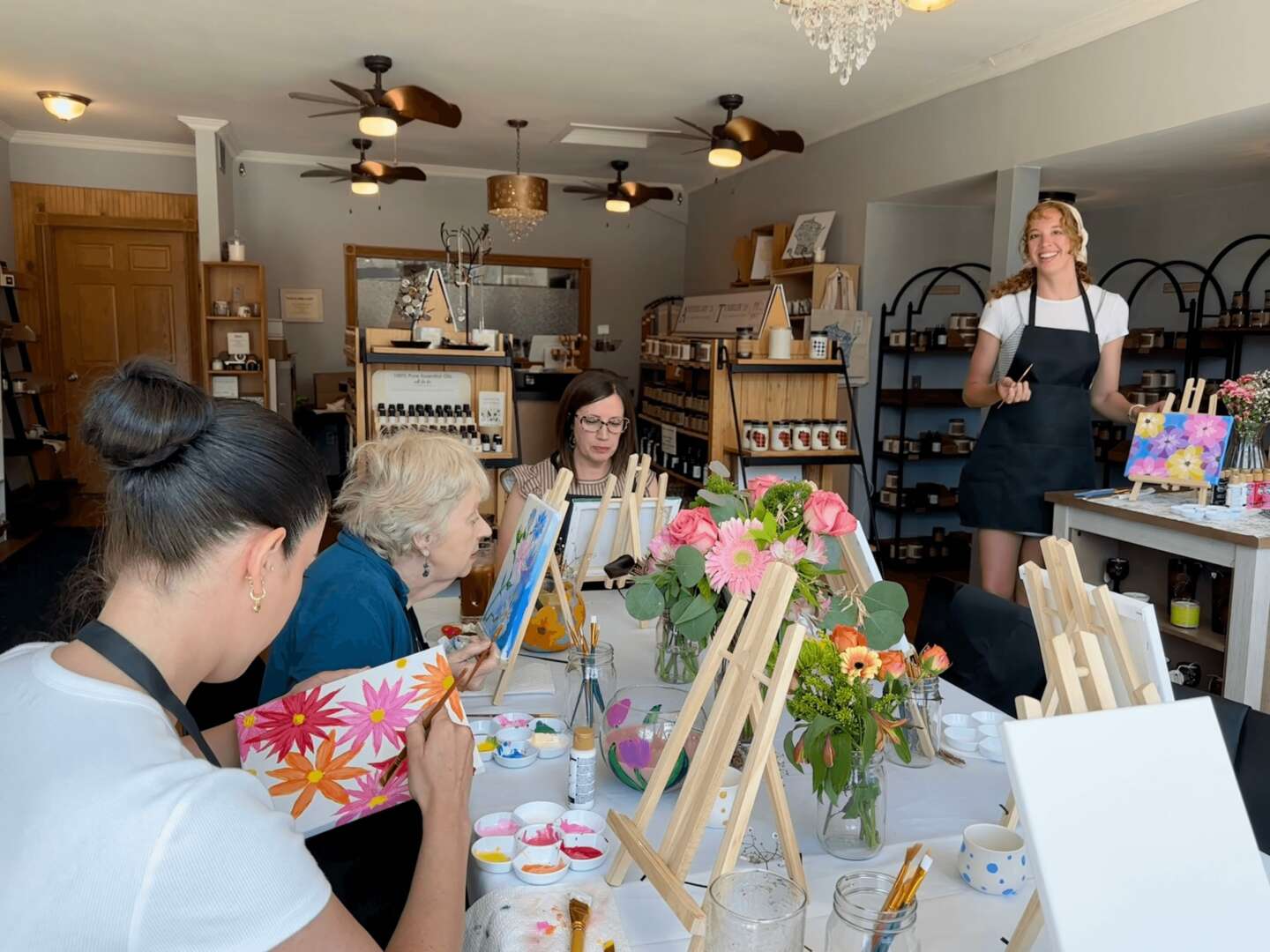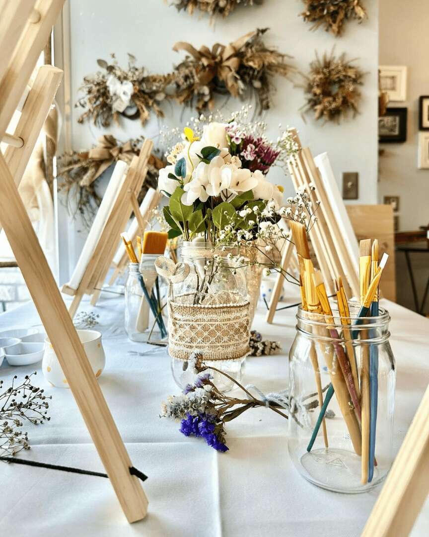 In addition to murals, I am the co-founder of a painting party business called Canvas and Company, which hosts intimate painting parties aimed at curating memorable experiences and meaningful conversations through art. My business partner and I set a beautifully arranged table with all the supplies needed for a painting party, along with thoughtful details that create an inclusive and peaceful atmosphere where conversation and creativity flow. I lead the classes while my partner assists the guests, and it has been incredibly fun and rewarding to share my painting process with others. In the end, all the pieces turn out so different, which speaks to human nature as we can all see the same reference and create something unique to the individual.