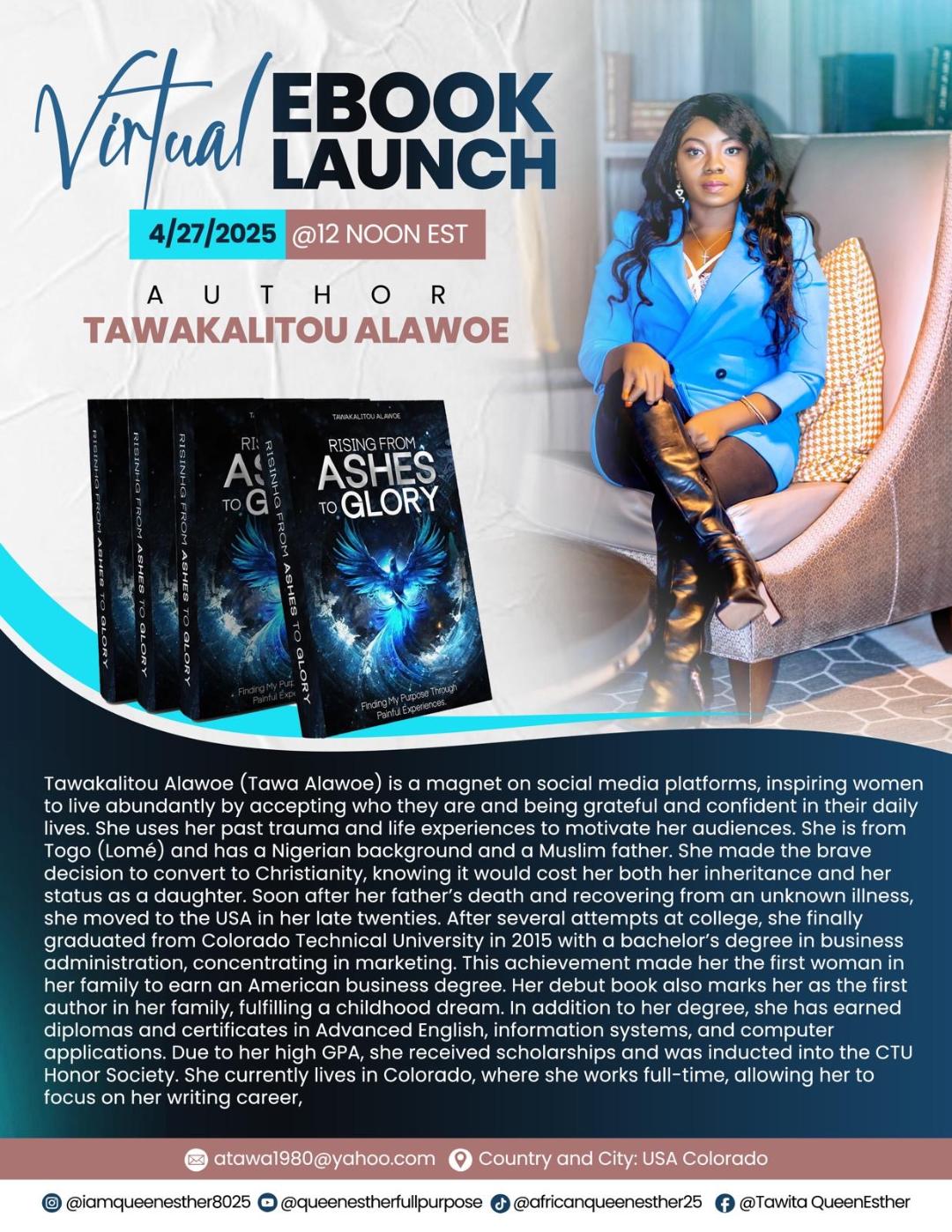 I am from Togo (Lome) and has a Nigerian background and a Muslim father. I made the brave decision to convert to Christianity, knowing it would cost her both her inheritance and her status as a daughter. Soon after her father’s death and recovering from an unknown illness, I moved to the USA in my late twenties. After several attempts at college, I finally graduated from Colorado Technical University in 2015 with a Bachelor’s degree in Business Administration, concentrating in marketing. This achievement made me the first woman in my family to earn an American business degree. My debut book also marks me as the first author in my family, fulfilling a childhood dream.