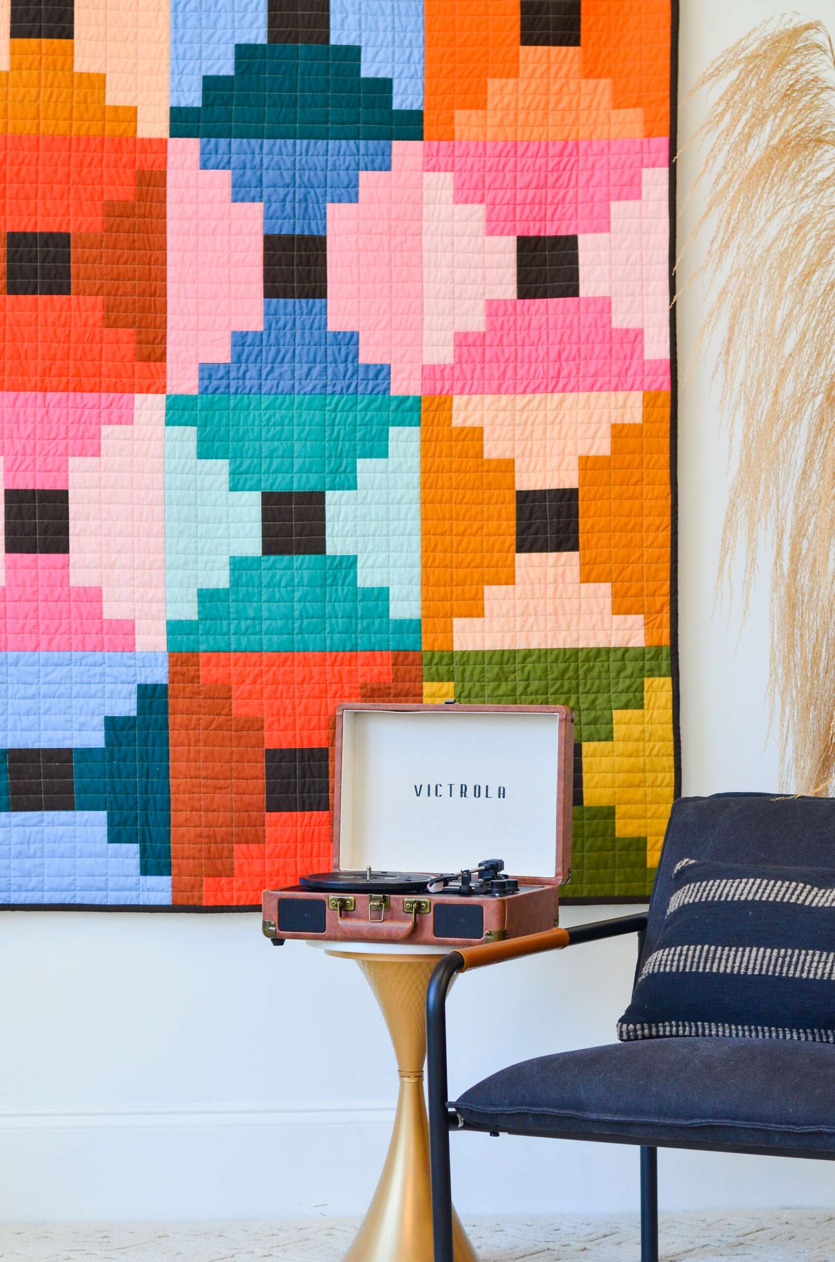 Fast forward to today, and I’m running Toad & Sew full-time! My work focuses on designing bold, modern quilt patterns that inspire creativity and empower others to make something they’re proud of. My first original design, the New Year’s Kiss Quilt, launched in late 2019 and quickly gained recognition, even being featured at QuiltCon 2022 and the International Quilt Festival. Beyond patterns, I’ve recently started teaching classes and workshops to help quilters build confidence in their skills and explore basic color theory techniques they can incorporate into their quilting practice.