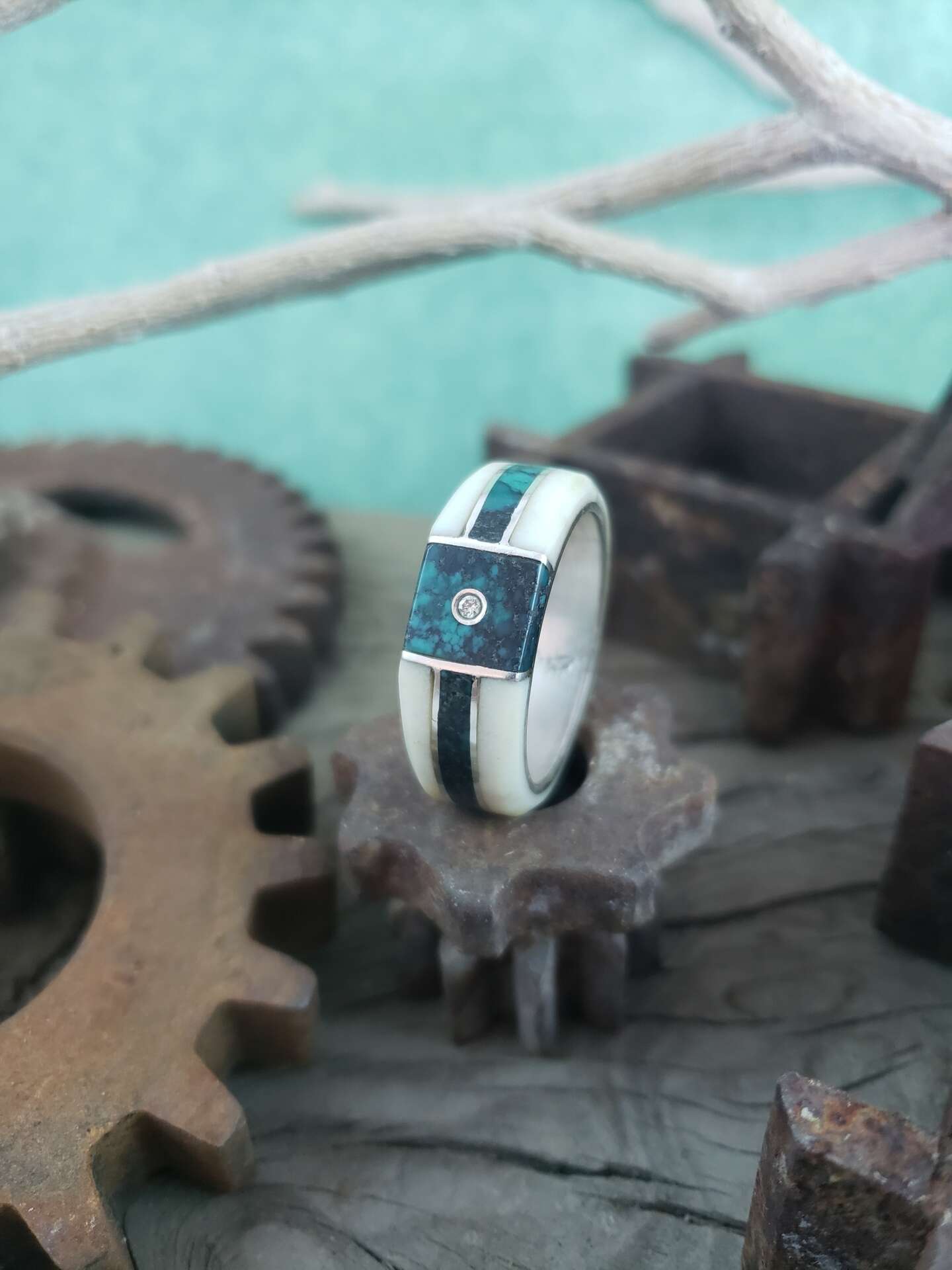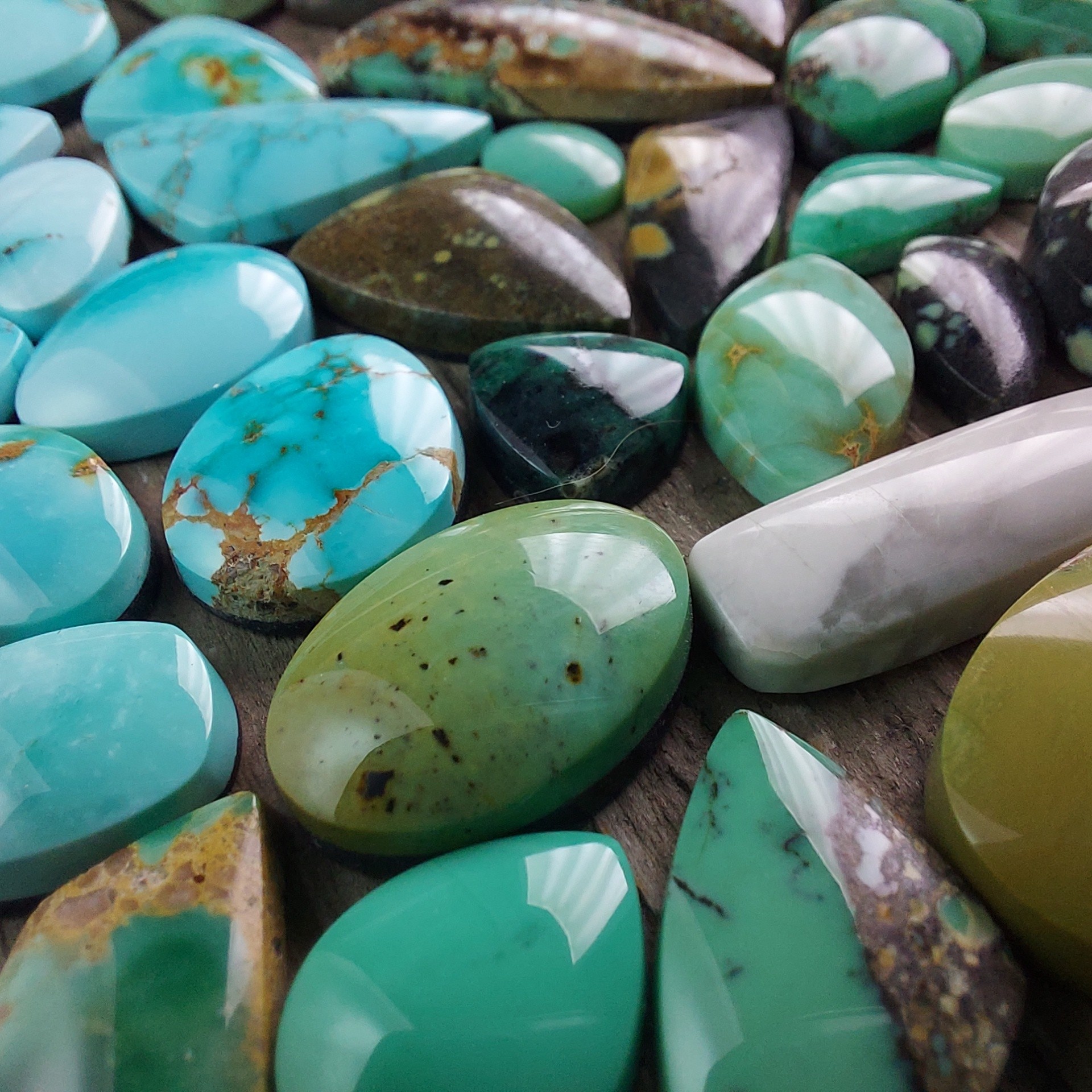 We currently offer start to finish jewelry, rough turquoise, and cut stones (cabochons) for other jewelers. Our turquoise mine is near our home in Nevada and we spend a lot of our time working the ground by hand to pull out the beautiful stones. Those stones come back to our home based shop for us to process and cut each one. Once the stones are finished, they are then used in our jewelry! We hand fabricate each setting to ensure each client gets a one of a kind piece!