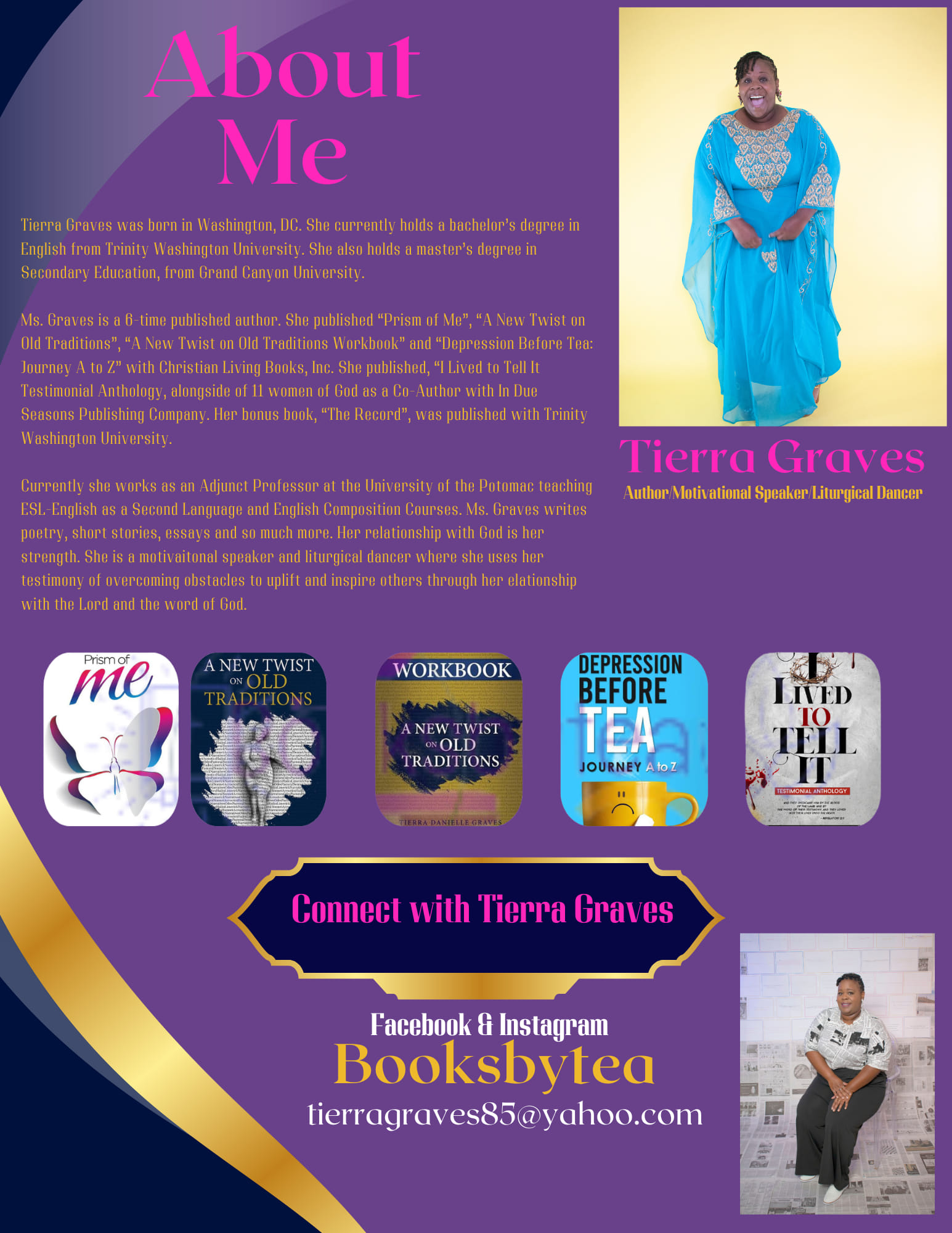 Currently she works as an Adjunct Professor at the University of the Potomac teaching ESL-English as a Second Language and English Composition Courses. Ms. Graves writes poetry, short stories, essays and so much more. Stay connected with the Author on Facebook and Instagram (Booksbytea).