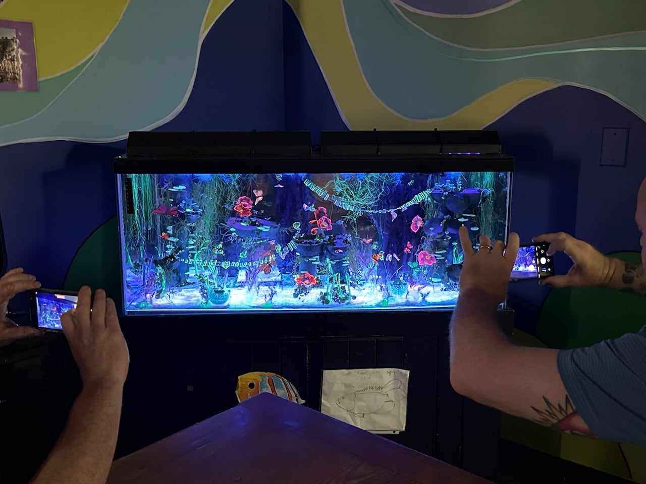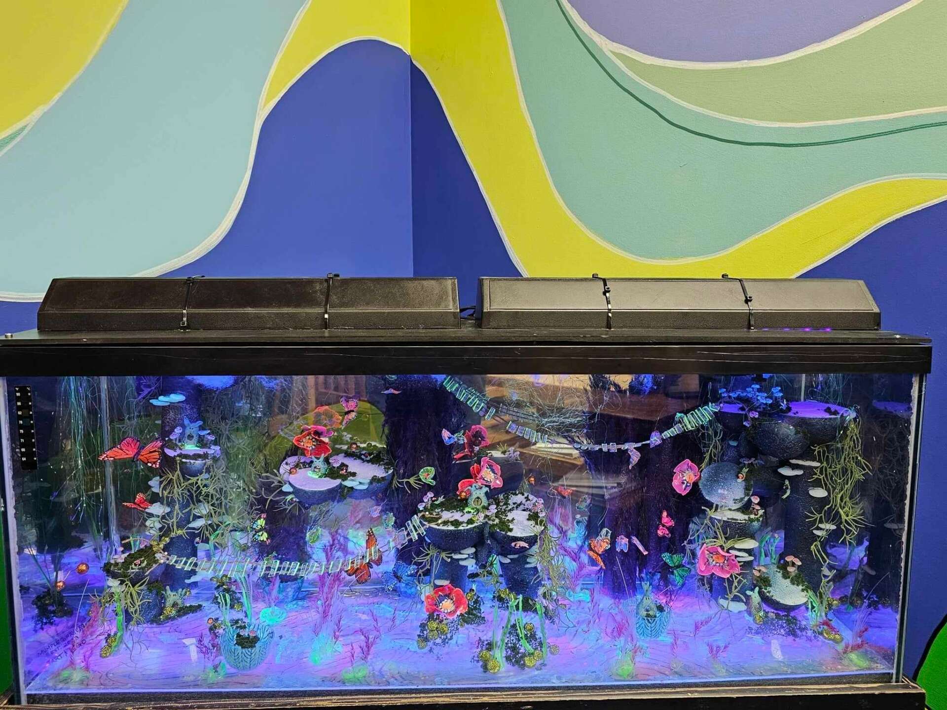 This #SafePlaceWalls initiative has become a labor of love, as artists from various backgrounds, both professional and inexperienced, joined forces to contribute their unique artistic voices. Together, we are painting murals, creating installations, and crafting a campus that is as unique as the clients who pass through and the incredible staff of humans who support them. This project began officially 9 months ago, and we have already completed multiple projects, including more than 20 individual murals on campus and the installation of my most complicated artwork thus far. The “Mumplequarium,” once an old 50-gallon fish tank, has been transformed into a moving LED foam and plastic zero maintenance therapy tank, filled with Mumples and butterflies and snails living in an entire imaginary world. So far, the impact of this art transformation on the youth and the positive ripple effect it’s having across campus to the entire Safe Place community has filled me with immense joy and fulfillment, and other artists and community members are eager to join the project.