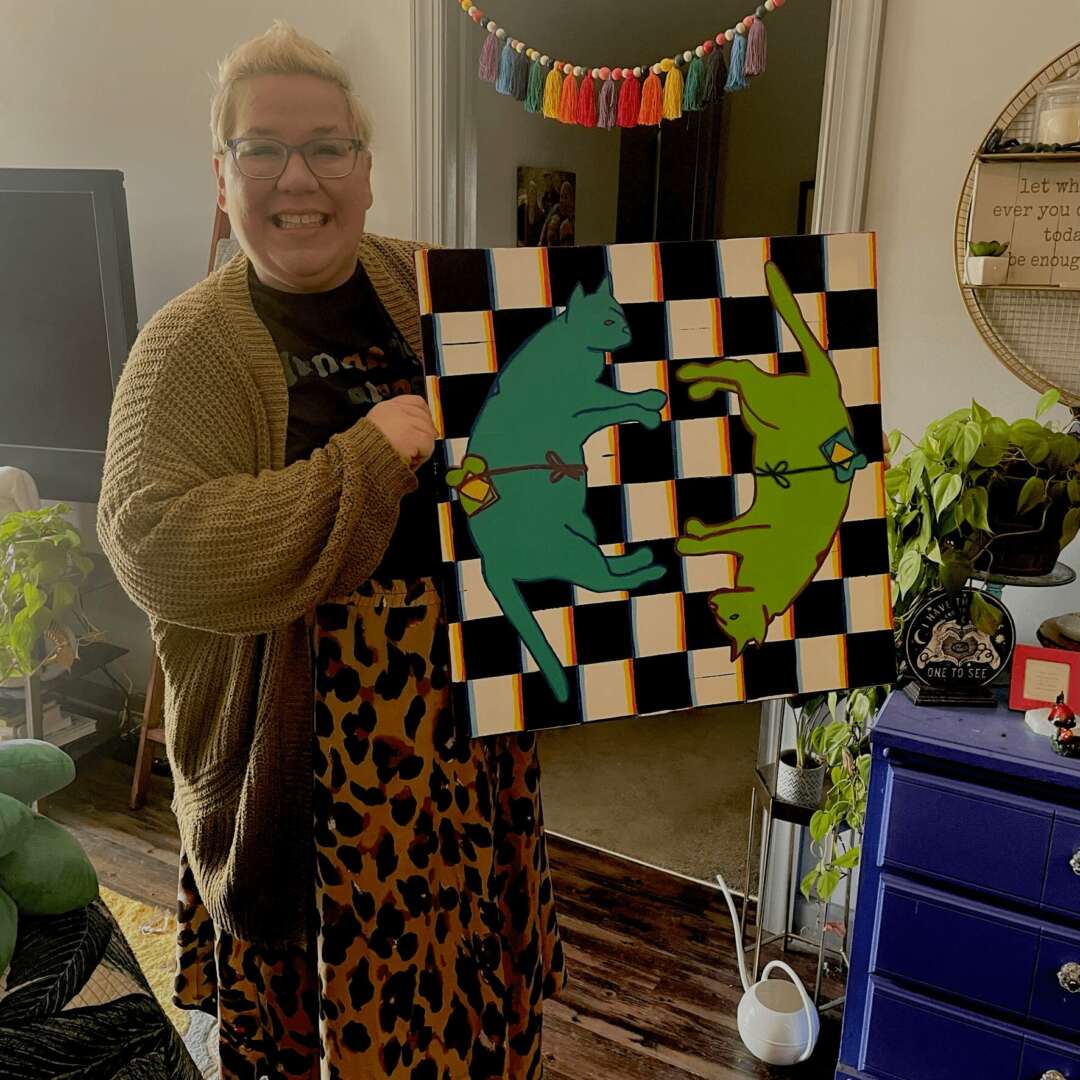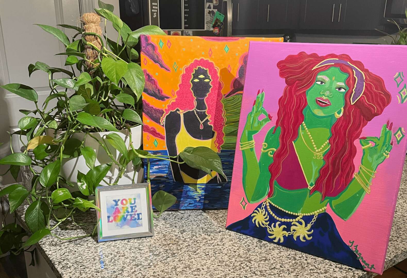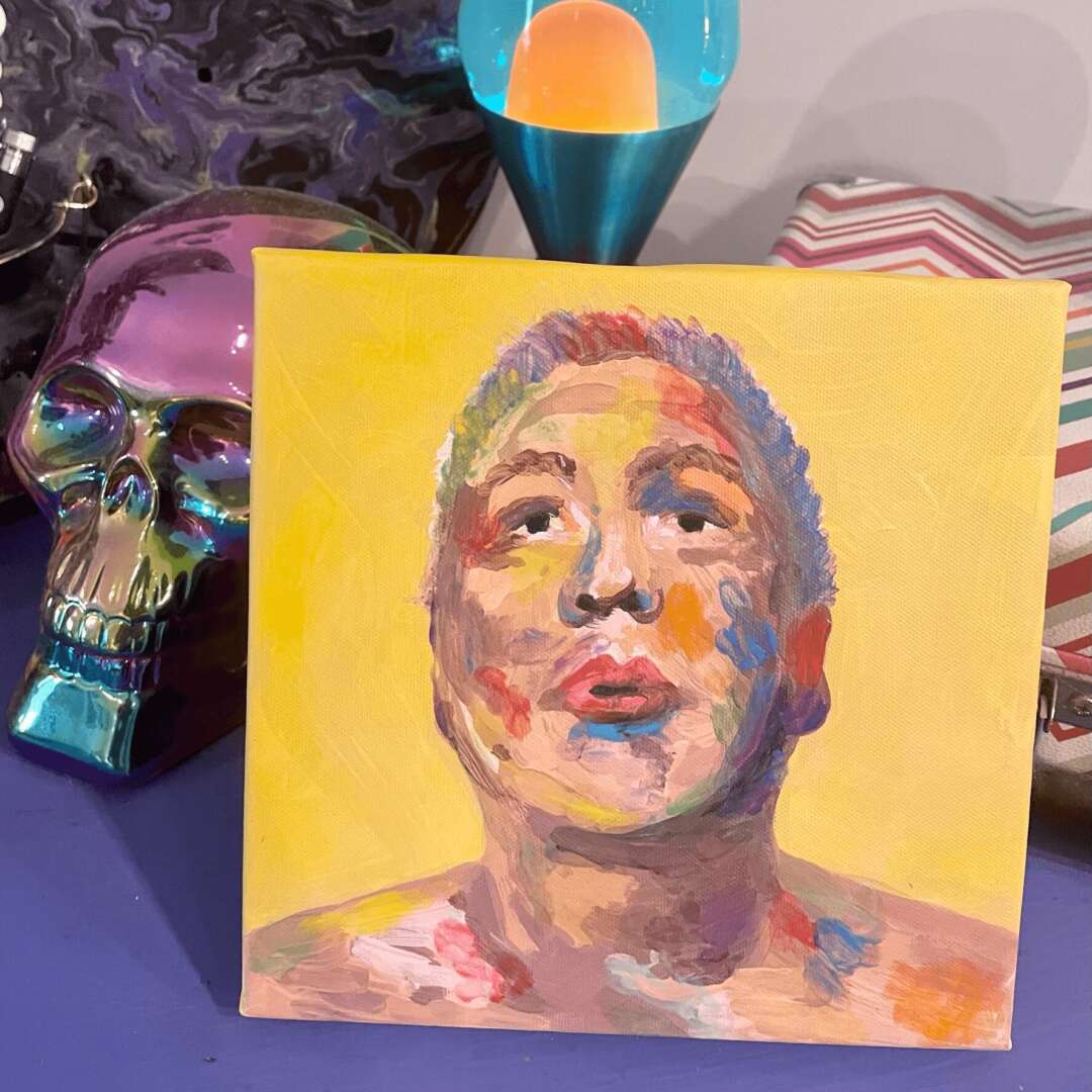 In 2021, I began painting and drawing again. I started with a portrait of my boyfriend and a colorful self portrait. Over the next couple of months,, I created in a whirlwind it felt like every hour I had outside of work was spent creating. I was lucky enough to be surrounded by beautiful community of other artists and people embracing various forms of creativity. I balked at calling myself an artist, despite selling my first large piece.