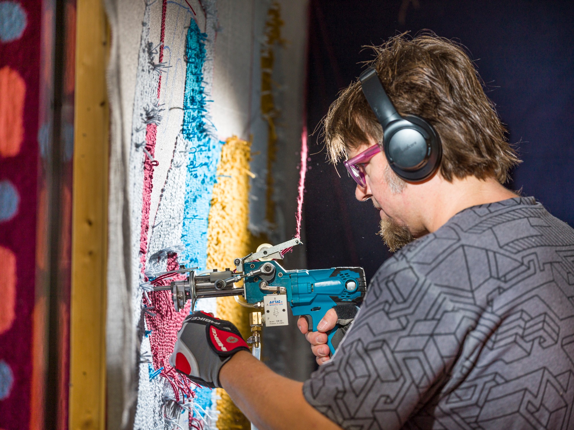 Man tufting in Tufting studio: Ed Newton