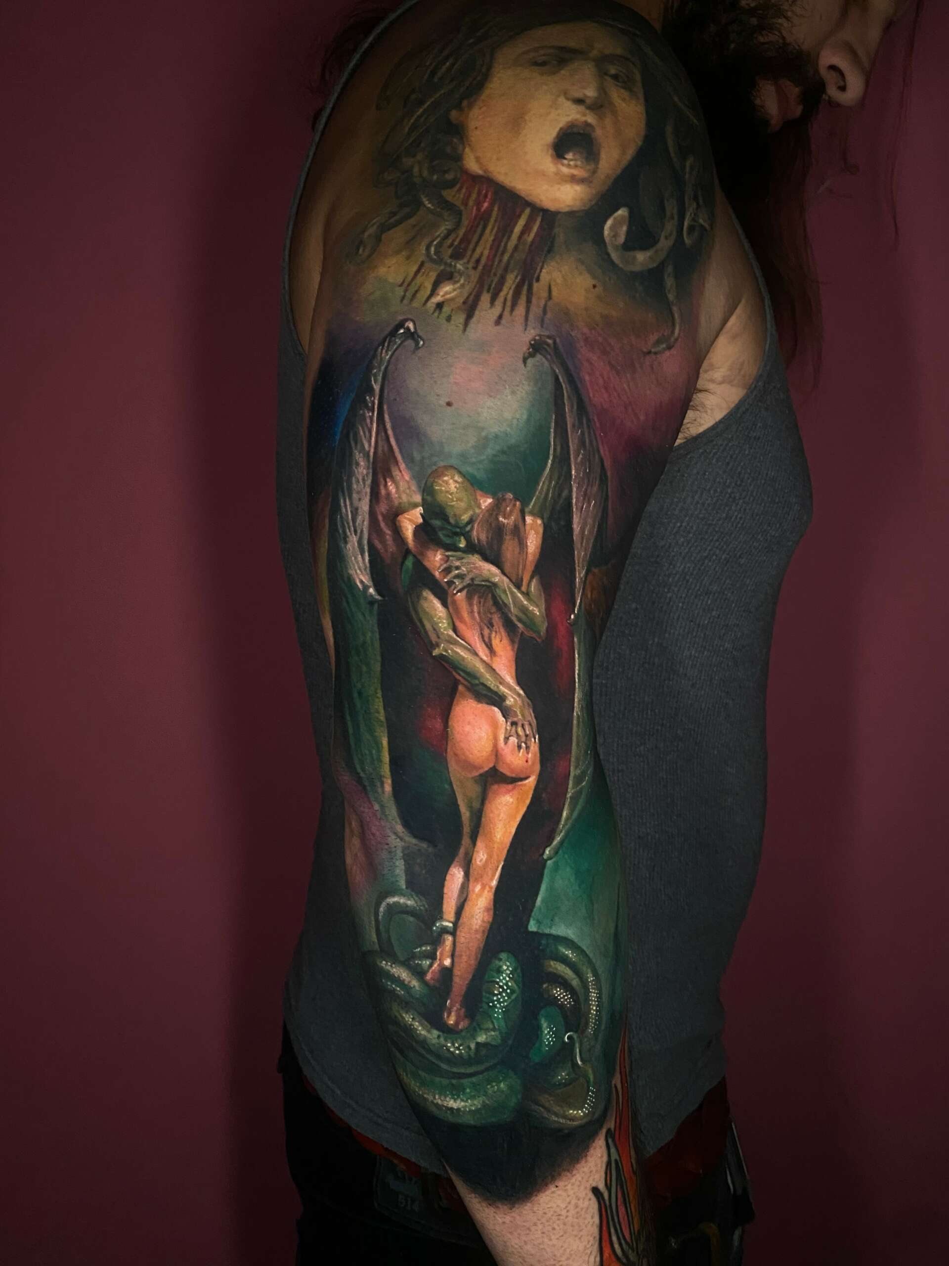 Now I’m about to hit my 11th year as a full time artist and I’m so proud of all that I’m able to offer my clients in their tattoo/self love/healing journeys. I currently specialize in black and grey as well as color realism, hyperrealism, surrealism, micro-realism as well as trash polka, comic book/anime and cover ups. I would also consider myself to be proficient in most other styles and will respectfully approach almost any other style if it’s truly what that client wants; but, for the most part, clients who come to me are looking for what they see I do best and pour my creativity deeply into.