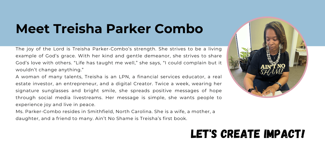 I am my Brand Treisha Parker Combo. I’m an Inspirational Author, Speaker and Financial Advisor. I am a wife, a mother of three girls. I wear many hats women ministry secretary, mentor and volunteer. I can go on and on. My first business venture started in 2017 as a Paparazzi Consultant. I’m a Notary, house flipper and a LPN. I enjoy working with others, encouraging them and motivating them to push forward. I offer workshops for my clients to help them work through their Shame.