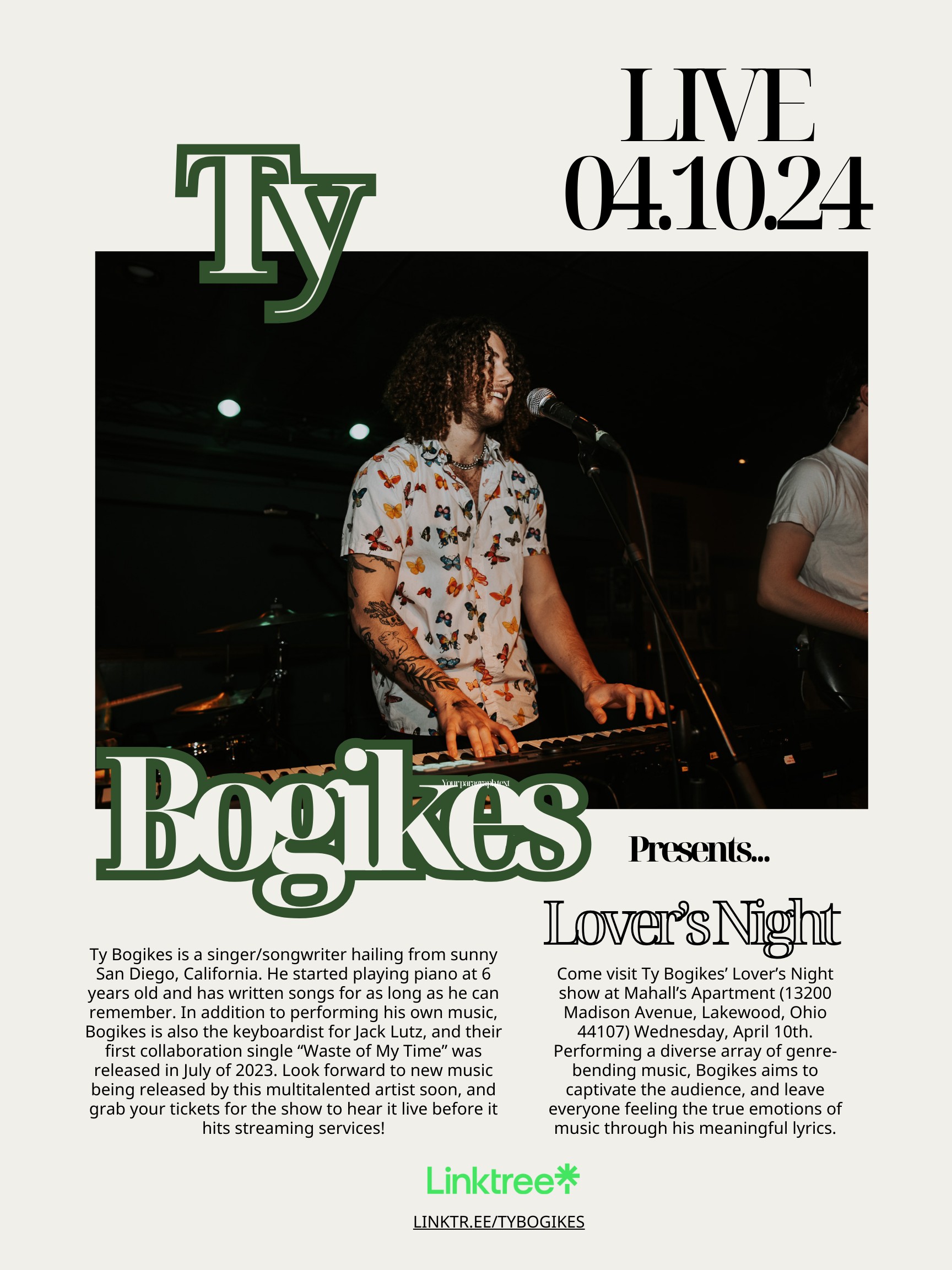 My name is Ty Bogikes. I am a singer/rapper, songwriter, and keyboardist from San Diego, California. I value making a diverse array of music, filling my catalog with songs that express how I felt in a specific moment or era of my life. I want people to look to my music to learn how to properly show love to themselves, others, and the natural world, all while appreciating the beautiful sense of unity that music attracts.