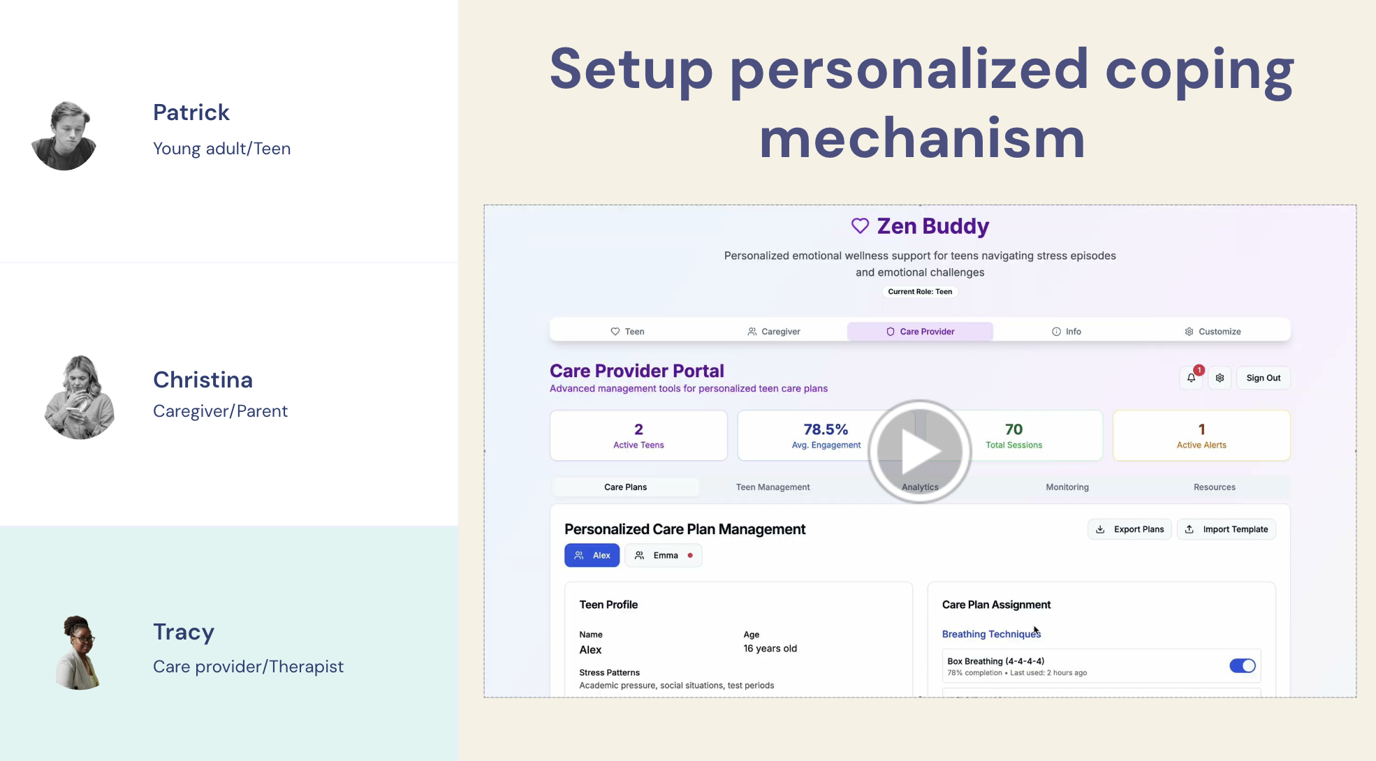 Instead of creating a medical tool, we turned ZenBuddies into a preventative wellness system for teens, focusing on stress awareness rather than treatment. The device now tracks changes in Apple Watch biometrics and gives simple, non-clinical nudges like “Take a breath” or “Something feels off—check in with yourself.”