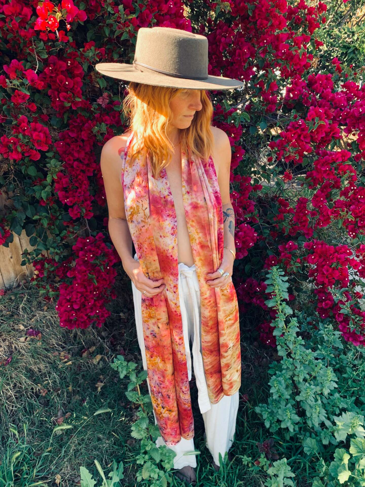 Botanical Spells is something that I am very proud of. I am passionate about health and plants, so being able to merge these two together feels really good. I am a natural dyer and artisan. I hand dye garments, and silks using only plants and Earth’s elements, I forage and collect flowers/plants from local farmers and help to take invasive species from the environment. For example, here in San Diego, Eucalyptus grows abundantly. It is a great dye plant, and also invasive. So by foraging it for my business, it also helps the environment thrive.