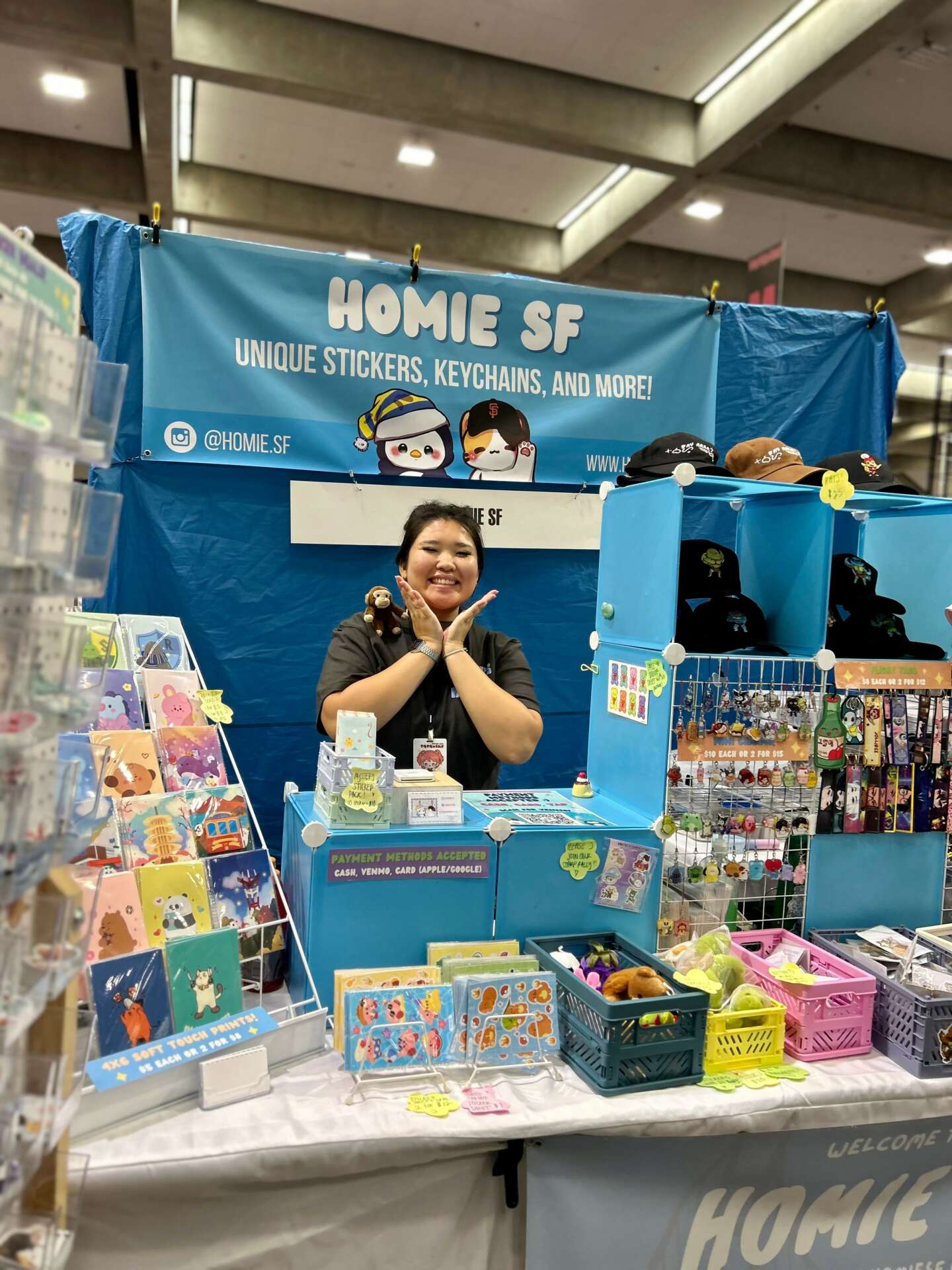 Let’s start from the beginning. My name is Vivian and I am the creator of a cute, little gift shop called Homie SF. Homie SF was an idea that I tossed around to close friends in November of 2021. After debating and debating, I officially joined my first event as Homie SF in January 2022. Funnily enough, I didn’t sell all the stickers, keychains, and products you see on my website now. I used to be a soap maker and that was the only thing I sold whenever I was at in-person events. My main inspiration for soap making came from watching one of my favorite Korean lifestyle YouTuber. She made these cute little gummy bear soaps and from there I fell down into a rabbit hole. I was watching hundreds of YouTube videos on how to make soap and doing different research on types of soap making methods. My very first batch of soap was obviously not the cutest, but they were usable and that was what made me instantly fall in love with making soaps!