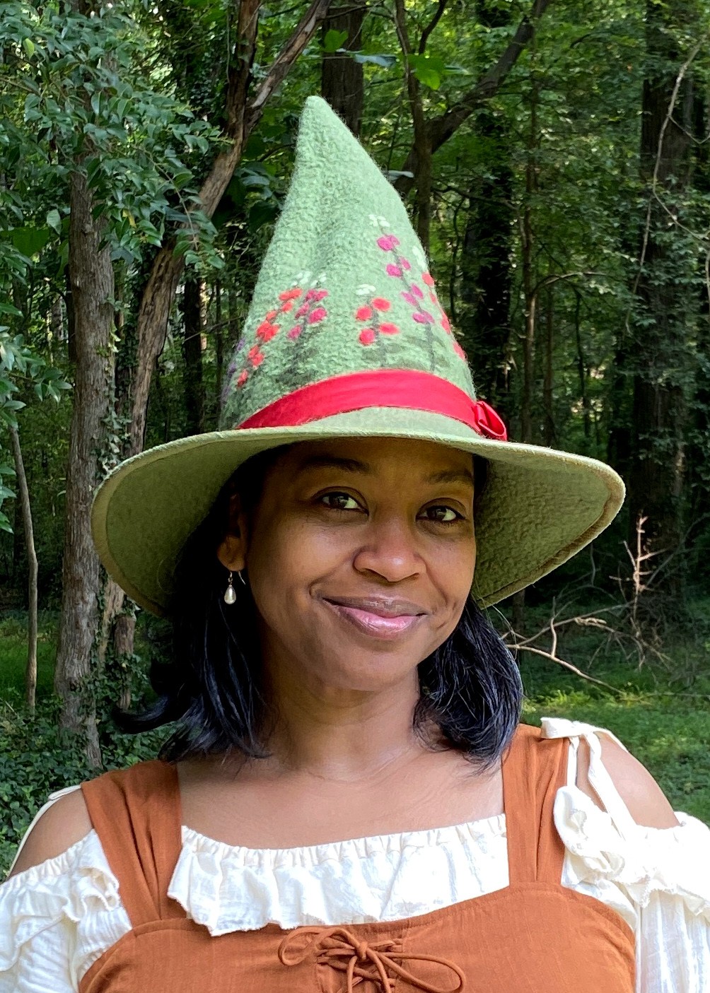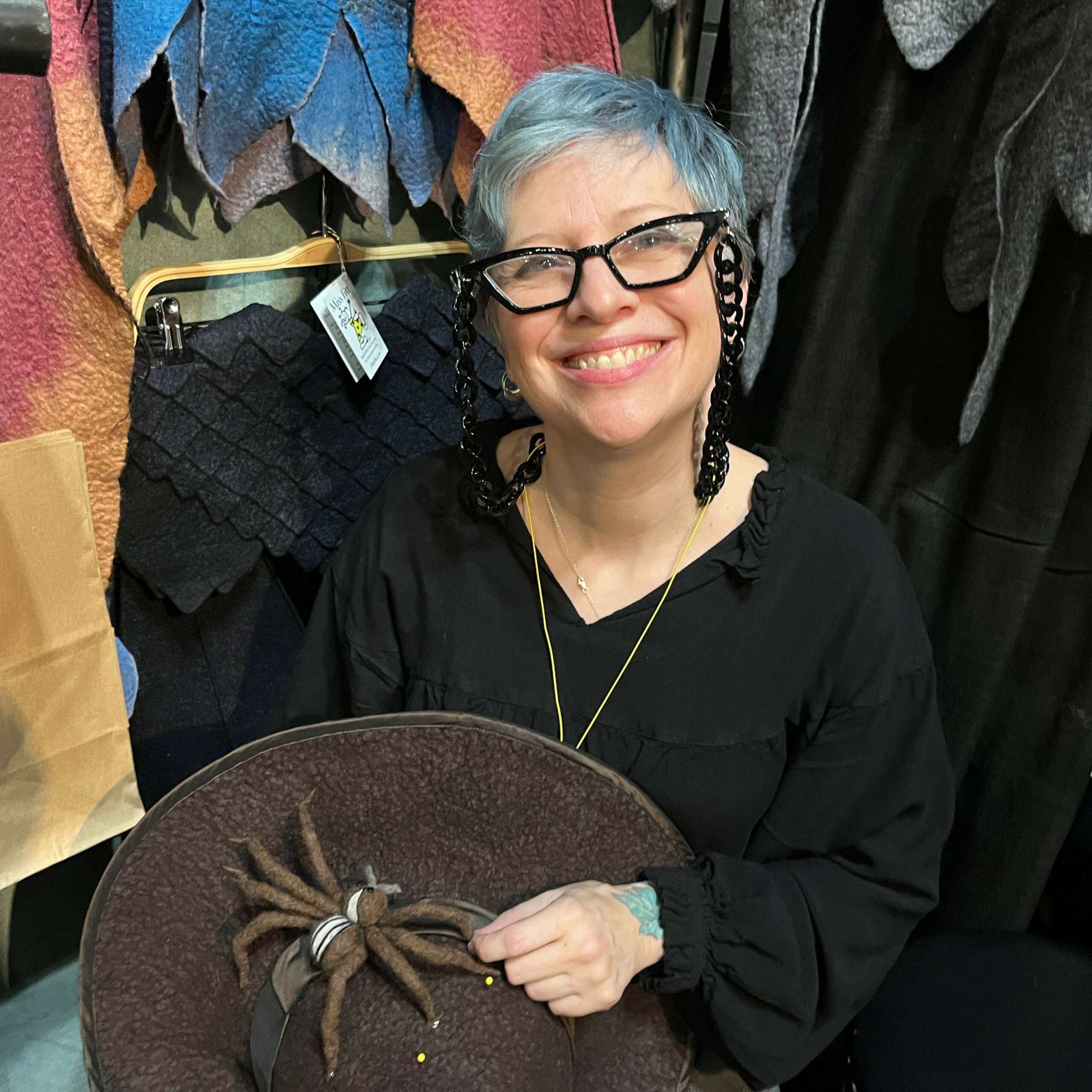 I love…what I do. Despite the fact that the difficulty of my work has taken it’s toll on my body over the past 24 years, nothing gives me greater pleasure than designing a really fun new witch hat in beautiful colors and then experiencing the delight of the customer who chooses it as their own. My husband recently started helping me out at comic cons and after the first one he said “Oh. I get it now. You make people so happy with the things you make. That’s why you keep doing this.”