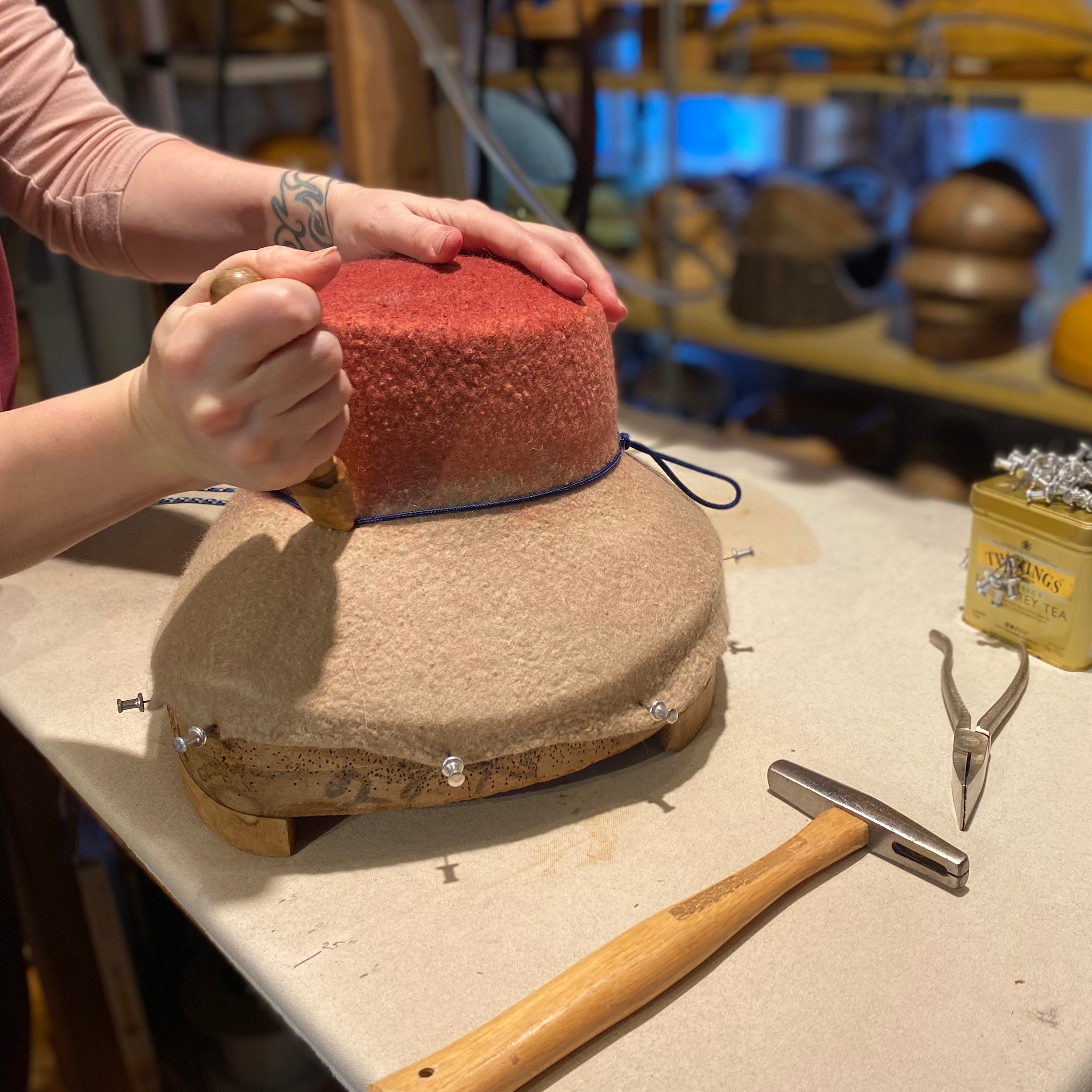 I also had to learn how to make different hat shapes using wooden hat blocks. Hat blocks are super expensive so I had to learn to be inventive with the few that I could afford at first. I will say that starting with with almost nothing and learning how to do it on the fly pushed me to use what I had to hand and learn to be inventive with the tools I could afford. I would argue that scarcity is often the real mother of invention.