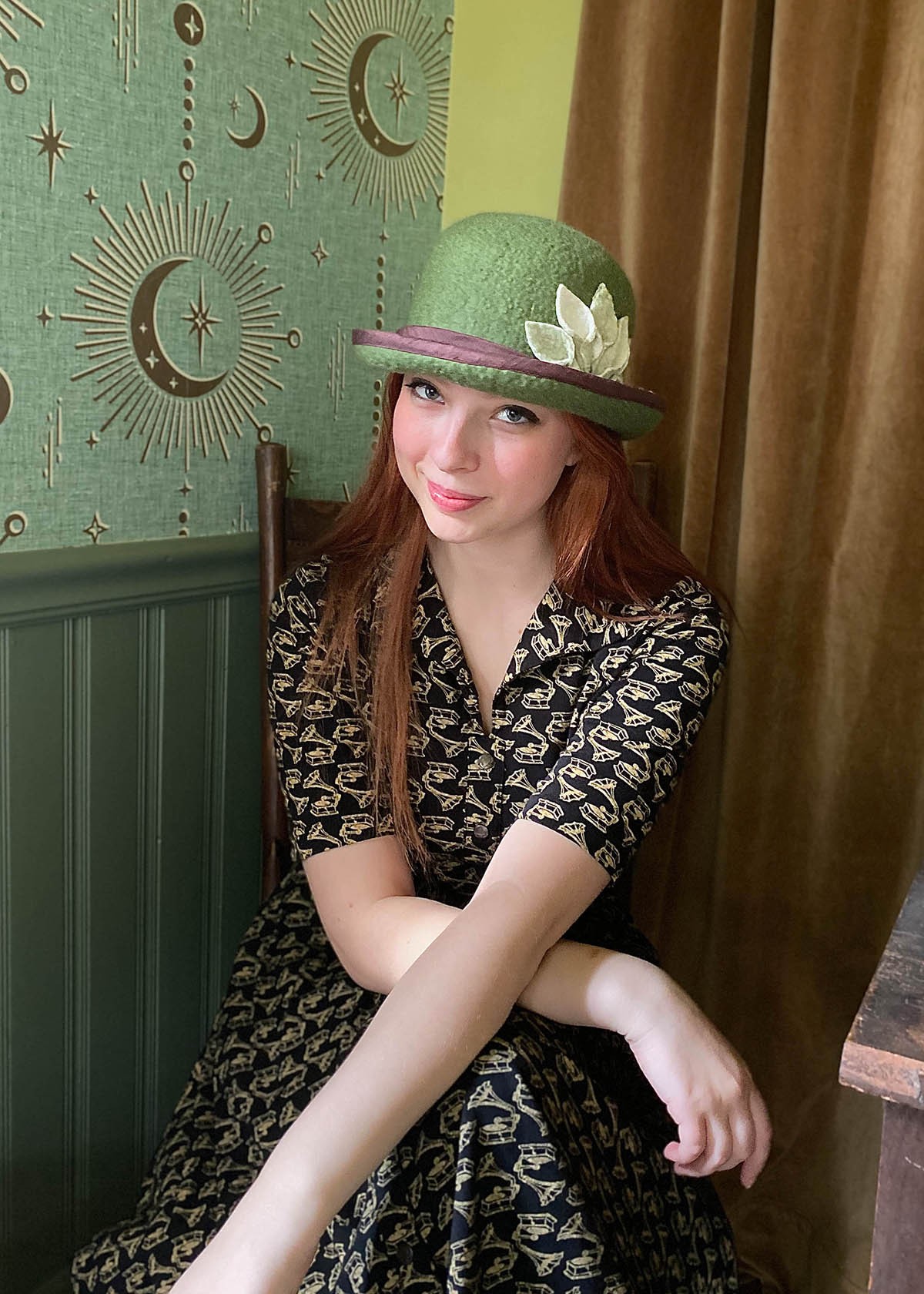 My original line, launched in 2000, is a vintage inspired (primarily) ladies line which includes hats, fingerless mittens, flower pins, and various scarves. In 2014 I launched a second line called Moss Fete (rhymes with bet, french for festival) that is a literary fantasy inspired line. This is my fun stuff, like fancy witch hats, dragon scarves, and owl wing capes. I primarily sell via in person high end craft fairs and comic cons up and down the East coast and as far west as St. Paul MN. My secondary sales venues are Etsy under Moss Fete and my own website missfitt.com.