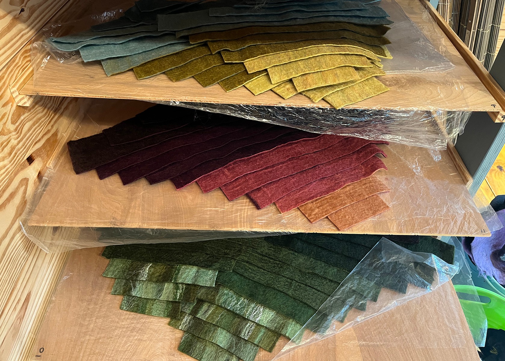 I design and make hand-felted Merino wool hats and other accessories. My base material is called roving, which are the wool fibers that have been sheered from a Merino sheep, washed, dyed and combed. At least two layers of those fibers are laid over different 3D resists depending on what I’m making. The roving shrinks an average of 40% during the felting process so I have to start pretty large. Next the item is wet down with hot soapy water and partially felted inside and out using a power sander with a piece of vinyl attached where the sandpaper usually goes. After that it goes into the washing machine with a bunch of rubber balls to finish the felting process. This step has to be timed carefully so that each item shrinks to exactly the right size. Once felted, the hats are blocked and flat items are stretched and left to dry. Blocking the hats involves stretching them over wooden forms that are the same shape as the final product. This step requires a fair amount of hand and upper body strength to stretch the hat over the form. Once the hat is dry it will be taken off the form, any excess felt trimmed away and the finishing work is done by adding binding and hat wire to the brim, a band inside and any other details added for that specific design. What I love about the medium of felting is the endless possibilities of shape and color you can achieve. Most of what I sell is short run production work, meaning I come up with a design, figure out how to make it, write down how I made it and then reproduce that design in a variety of colors over the course of a few years. I also produce special one of a kind pieces throughout the year as well as custom items requested by customers.