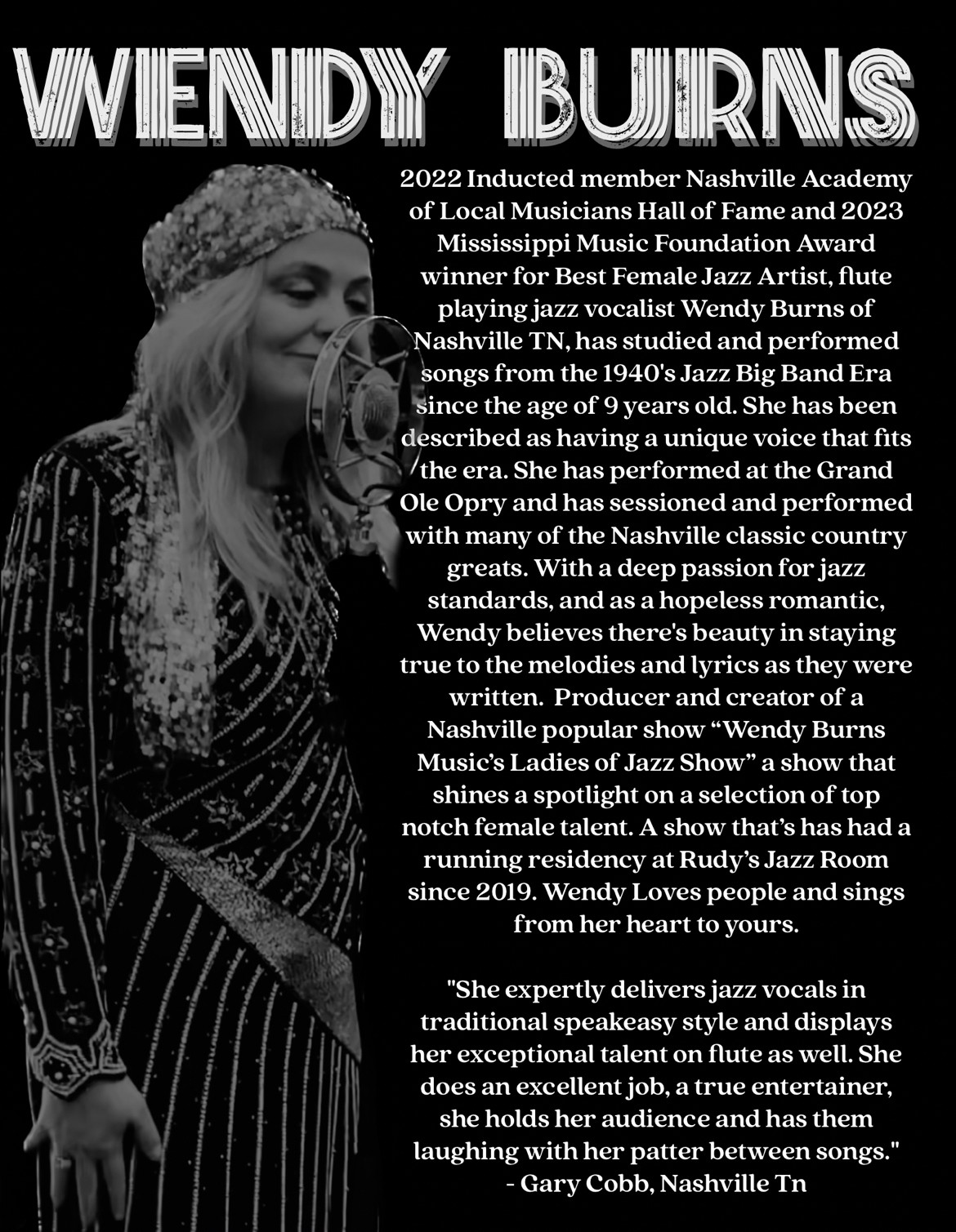 I am female jazz vocalist/artist/show creator producer/for the original Wendy Burns Music’s Ladies of Jazz Show, based out of the Nashville/ Franklin Tn./ 2022 Academy of Local Musicians Hall of Fame Inductee/ 2023 Mississippi Music Foundation awarded Best Female Jazz Vocalist of the year/ I love music and people so much,