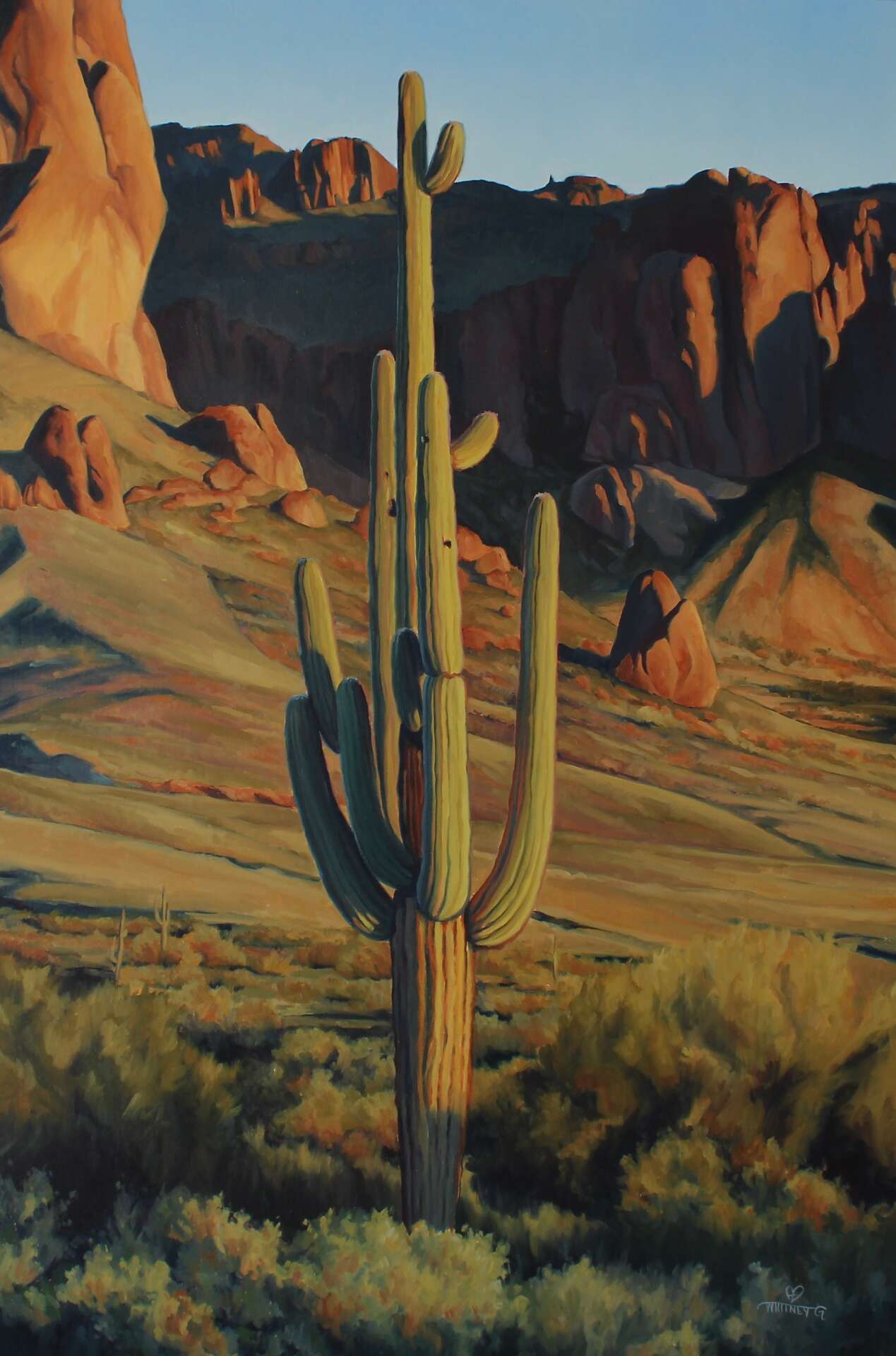 Of course, in 2010 the country was in a recession. I didn’t have a plan, and living in the desert where jobs were scarce, I took up a job at the local saloon. I hustled burgers and beers for tips and on my days off, I painted. Over the years, living in such a rugged and beautiful environment, I began to really see, observe, and understand the desert. And slowly, the desert made its way into my paintings. One day I just had an epiphany that the desert was all I wanted to paint. I had a strong calling to study and learn the moods of the desert in every way, and as a result, I became a landscape painter. I became determined to develop my skill, so I built a tiny studio on my property and studied the desert around me though my brushes.