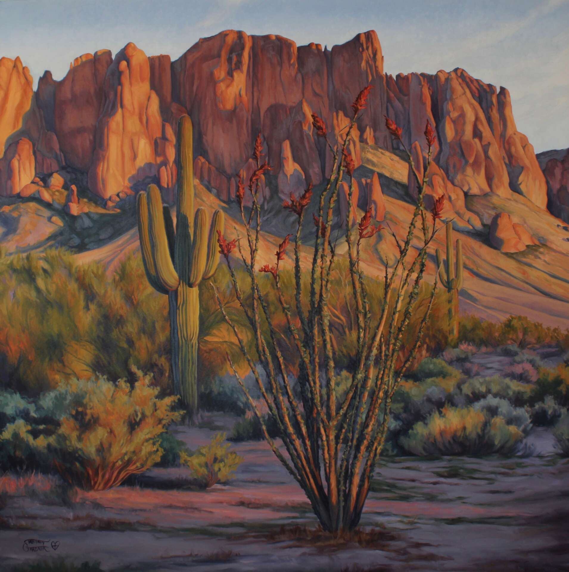 In 2019 I joined my local Twentynine Palms Art Gallery and submitted a few small pieces of desert landscapes. My new work was well received, and sold quickly. Months later I submitted a painting to the Joshua Tree National Park Exposition, and was awarded Best of Show for my painting Ocotillo Sky, which was a landscape of an Ocotillo with mountains. I felt encouraged, so I applied to have a solo show at the Twentynine Palms Art Gallery and was accepted. I worked for months to prepare new work for my show and ended the year with a solo show in my home town. Three works sold before opening night, and I knew I was on the right path.