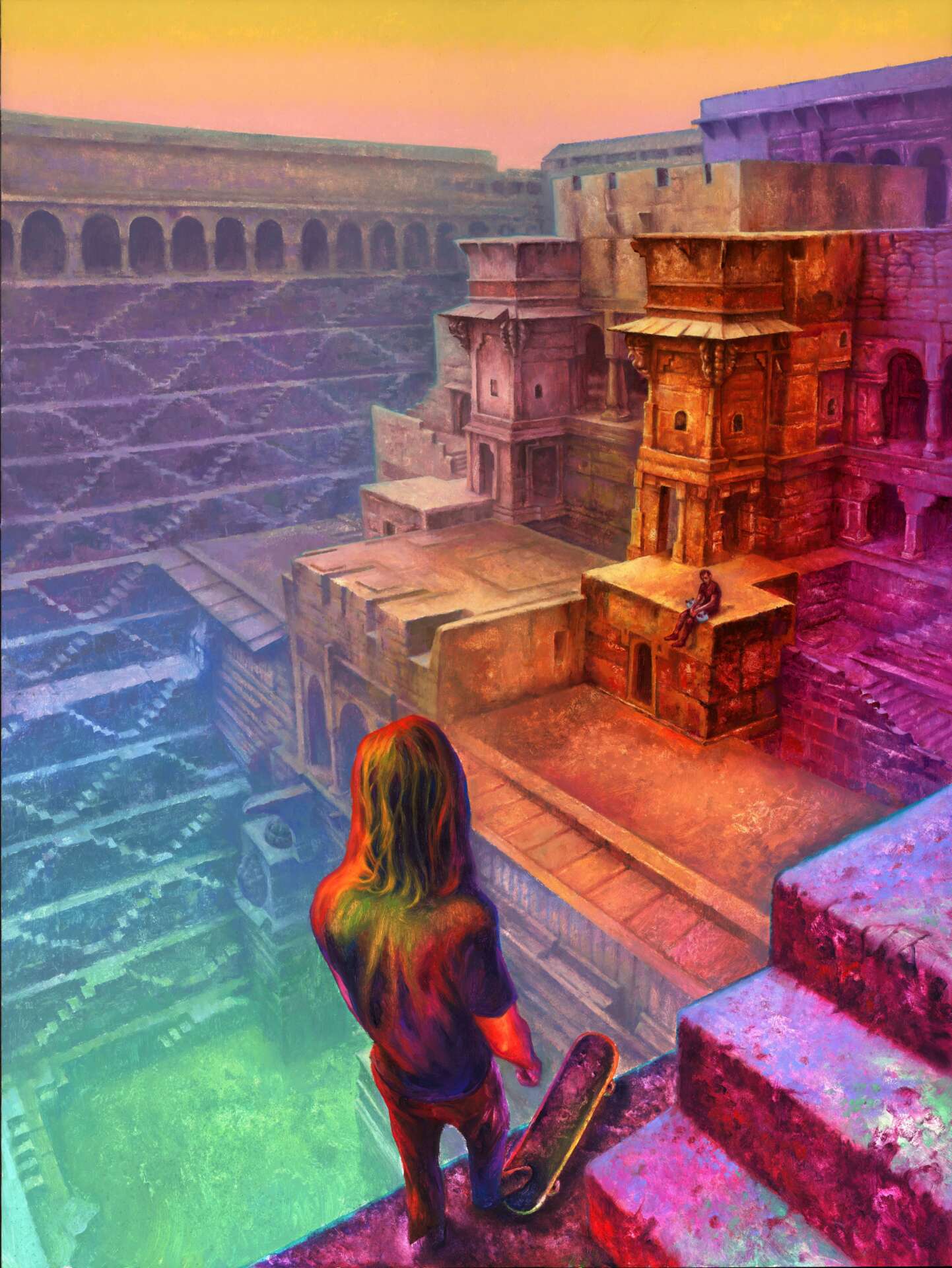 Somewhat numb to my usual shyness, I spoke with some of the people I’d regularly see out and about. Many of the people I’d met were also going through emotionally trying times or had survived some calamity in the past. Sharing trials and tribulations seemed to help people get things off their chest and routinely seeing them on my walks made me feel less alone. While walking one day, I was struck with an intense compulsion to paint my new acquaintances in their habitual spots. I wanted to depict their spaces transformed by their psychological states, as if their minds had overflowed into the surrounding areas. I felt like this would be a way for me to channel my own sadness into something productive, and make work that could help people having similar experiences feel less lonely. With their permission, I photographed them and got to work.