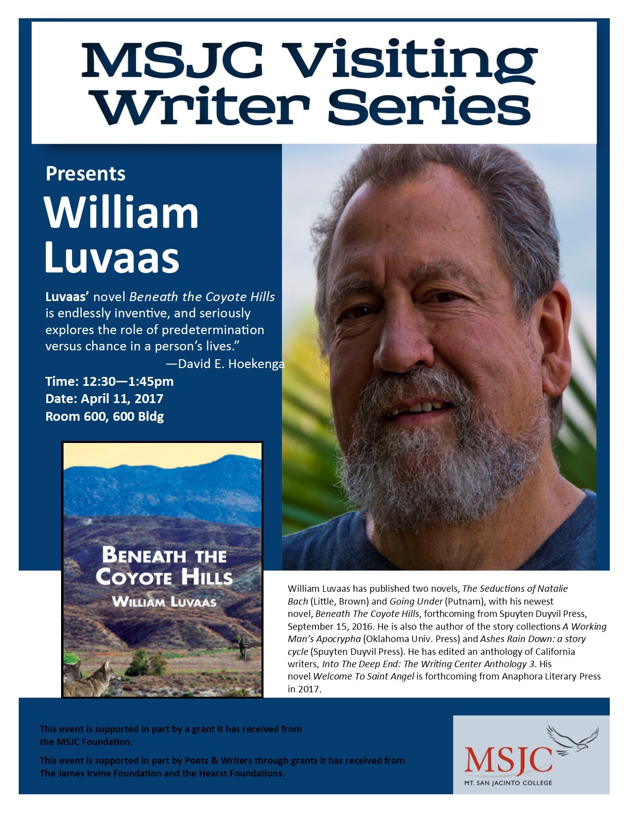 I was attracted to writing fiction because I love storytelling. Moreover, in my writing I can be fully myself, free from the constraints of the world. I have published four novels—The Seductions of Natalie Bach, Going Under, Beneath The Coyote Hills and Welcome To Saint Angel—and two story collections: A Working Man’s Apocrypha and Ashes Rain Down: A Story Cycle (The Huffington Post’s Book of the Year), which is set in a near future when climate change wreaks havoc in people’s lives. A new collection, The Three Devils & Other Stories, is forthcoming from Cornerstone Press. My honors include a National Endowment for the Arts Fellowship and first place in Glimmer Train’s Open Fiction Award. My books have been nominated for the National Book Award, The National Book Critics Circle Award and the Los Angeles Times Book Prize. Over one hundred of my stories and creative nonfiction pieces have appeared in numerous publications