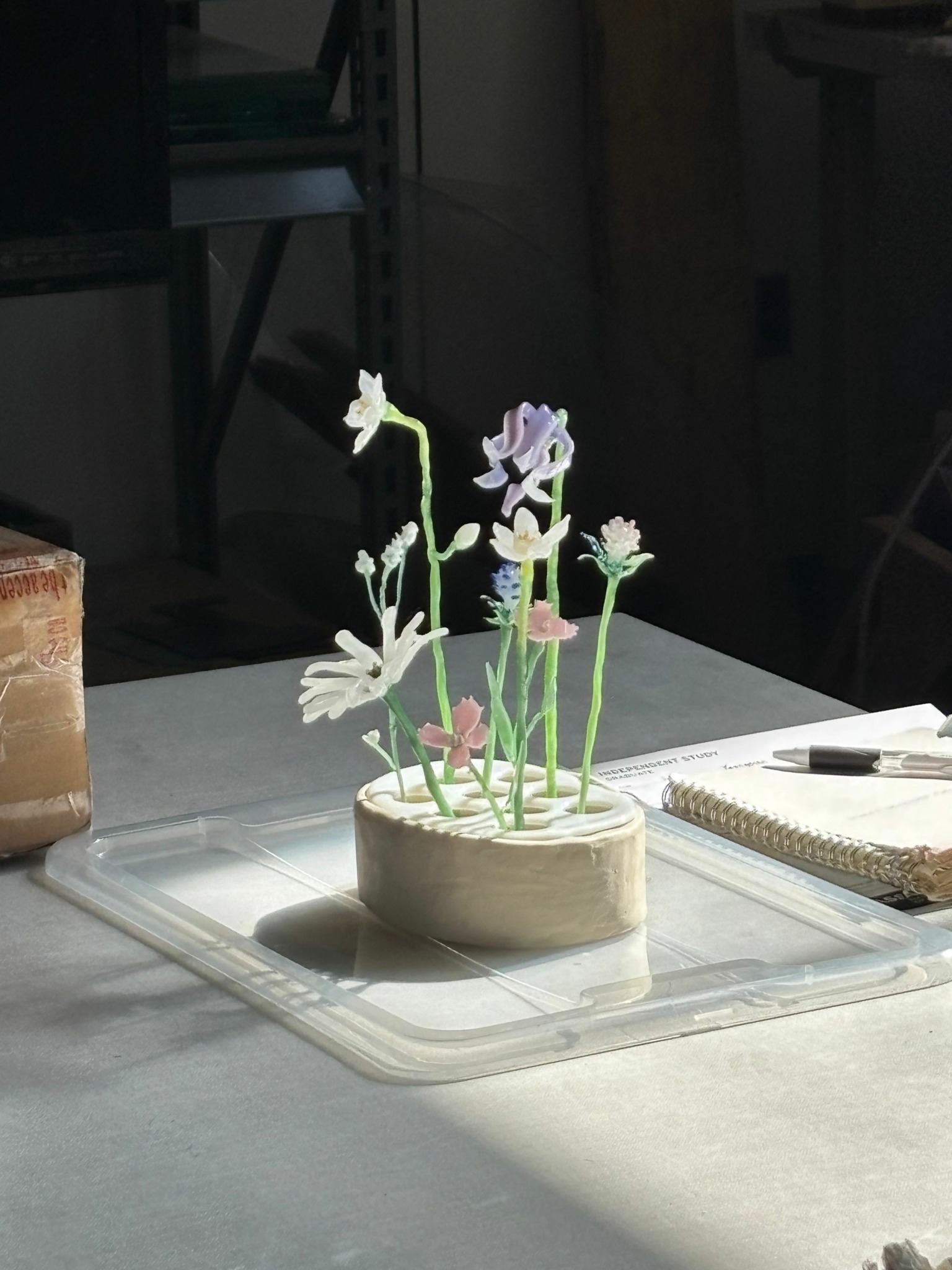 My main discipline is ceramics, but in recent years I have been integrating glass, ceramics, and painting into my practice. Through these materials, I create planters, vases, and sculptural pieces that explore themes of nature, transformation, and the fragile balance between beauty and imperfection. One of my recent works was a series called Endless Flowers, made with glass and a ceramic vase, as an attempt to capture the beauty of flowers while avoiding killing real flowers in my vase.