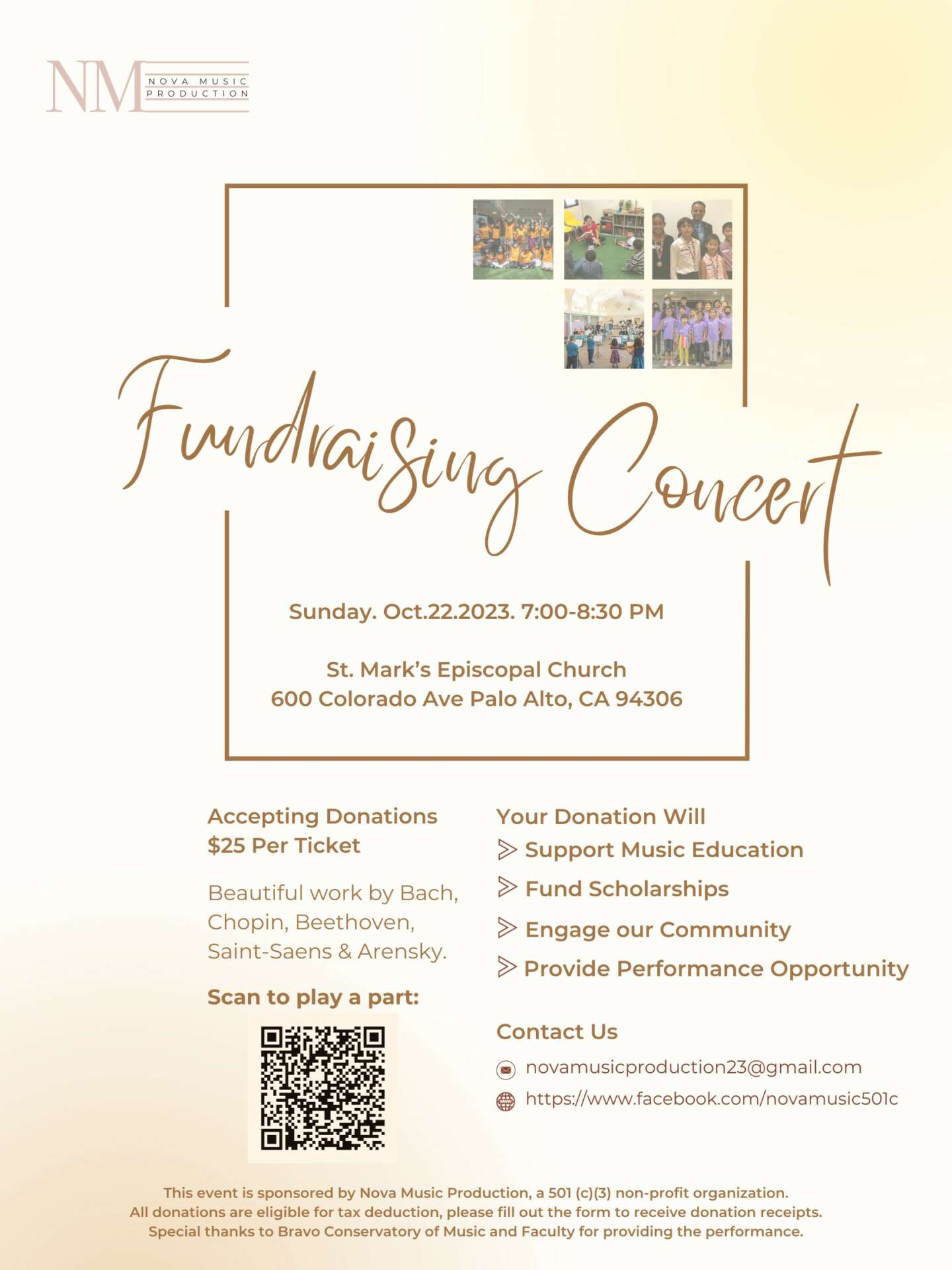 Nova Music Production 501(c) was founded this year with the mission of creating performance opportunities and supporting music education. So far we have hosted recitals and concerts in venues ranging from retiring homes’ lobbies to concert halls. All donations go directly to scholarship funds and performance-related costs, such as venue rentals, instruments, devices, and performers’ compensations. We are looking forward to establishing more charity concert series and music festivals in California and Asia, through the cooperation with other NGOs.