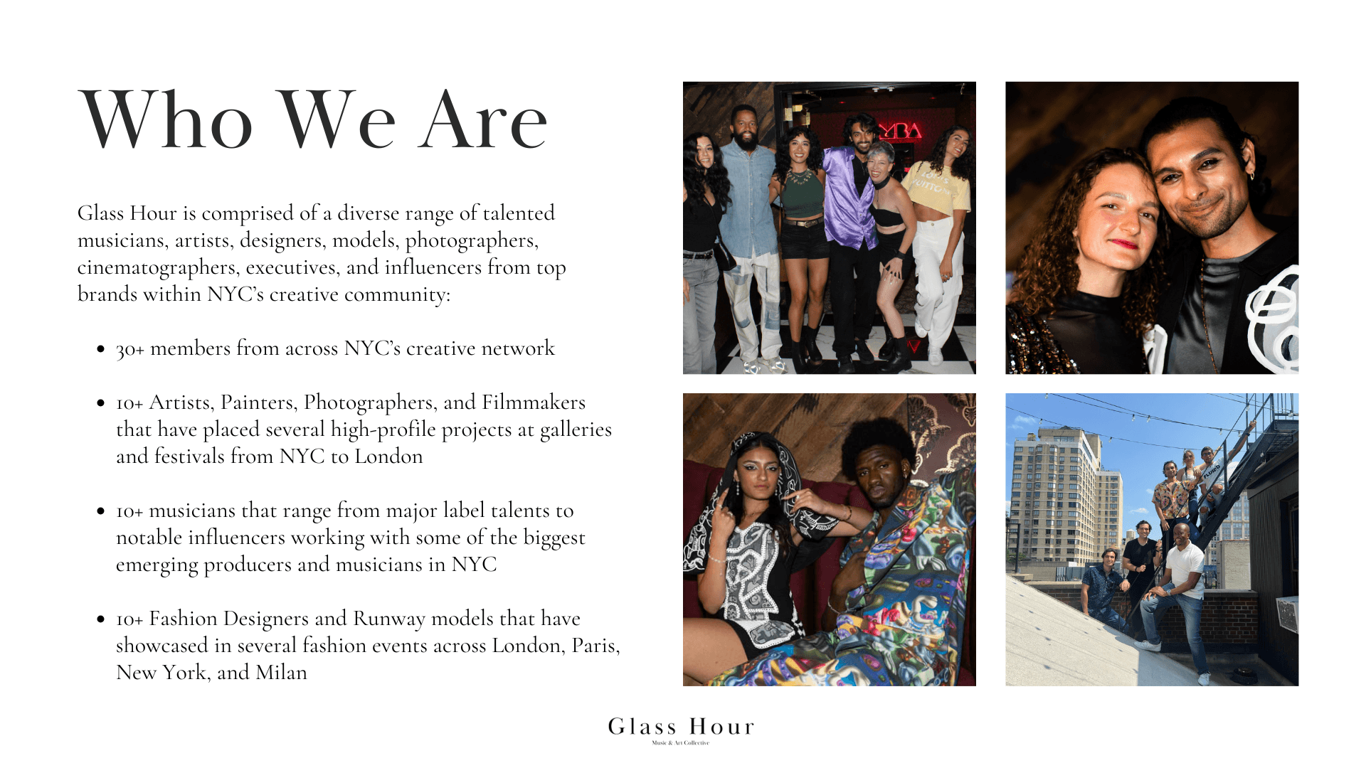 The Glass Hour Collective began when three friends and I decided to throw an art party. We pooled our resources and networks, and the event sold out. It was my idea to reach out to Angela Nikolau from the documentary Skywalkers I’d just seen on Netflix. I learned through her social media that she had recently moved to New York City, so I offered her the opportunity to showcase her work at our event. Securing her participation gave our first event a major boost, adding credibility and creating a unique experience for our audience. The event was a complete success, and our team had amazing energy, inspiring us to create more.