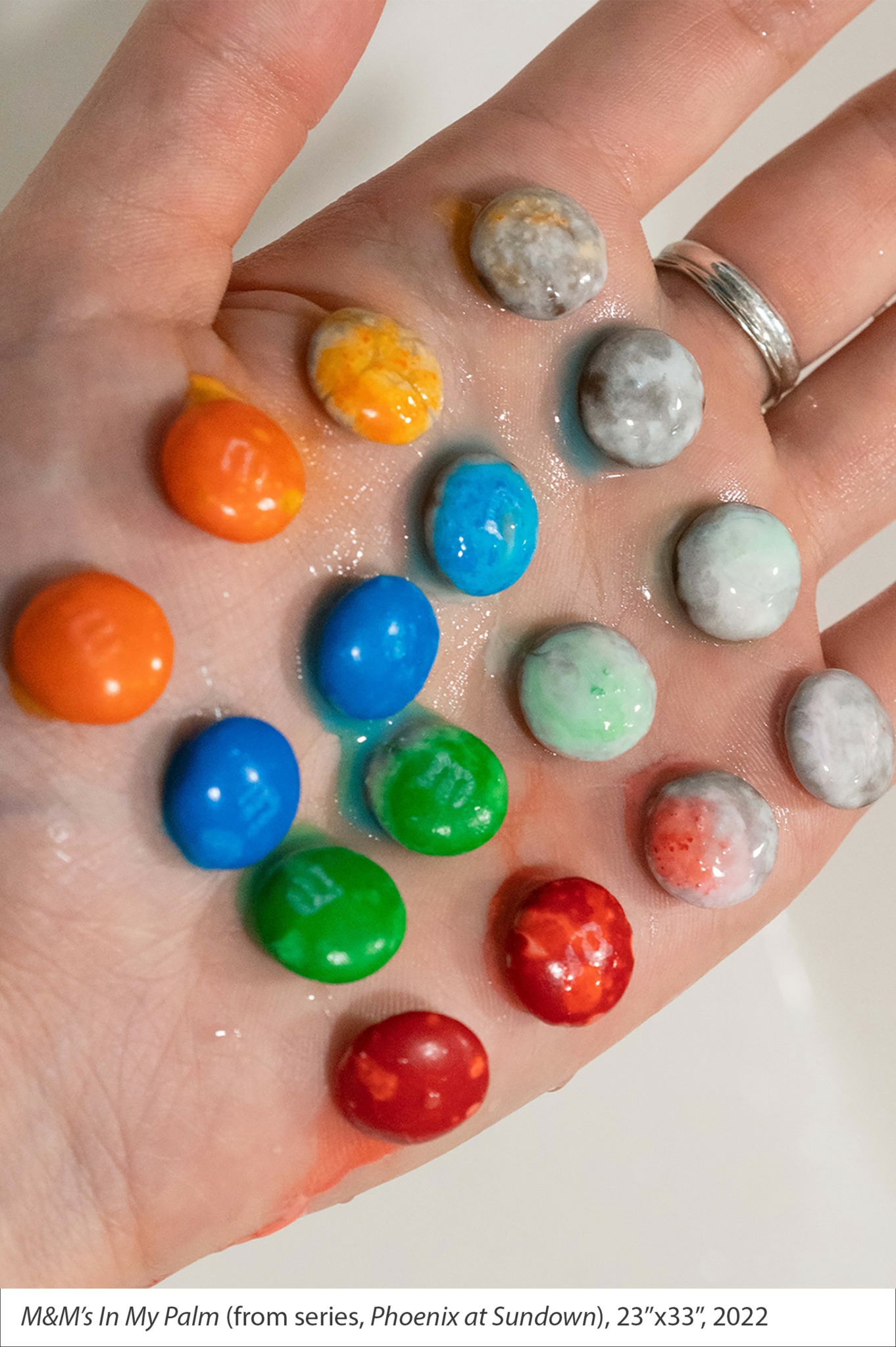 This project is an exploration through both her eyes and mine— what it is like to experience simultaneously the presence of memory and its absence. One image, of raindrops on a dim window backlit by sunset, reflects how dementia often worsens after the brightest parts of the day, casting a shadow on what was once so clear. Another shows melting M&Ms in my palm, a tribute to her love for order and sweets, but also an acknowledgment of the way memories dissolve, even as familiar things surround her.