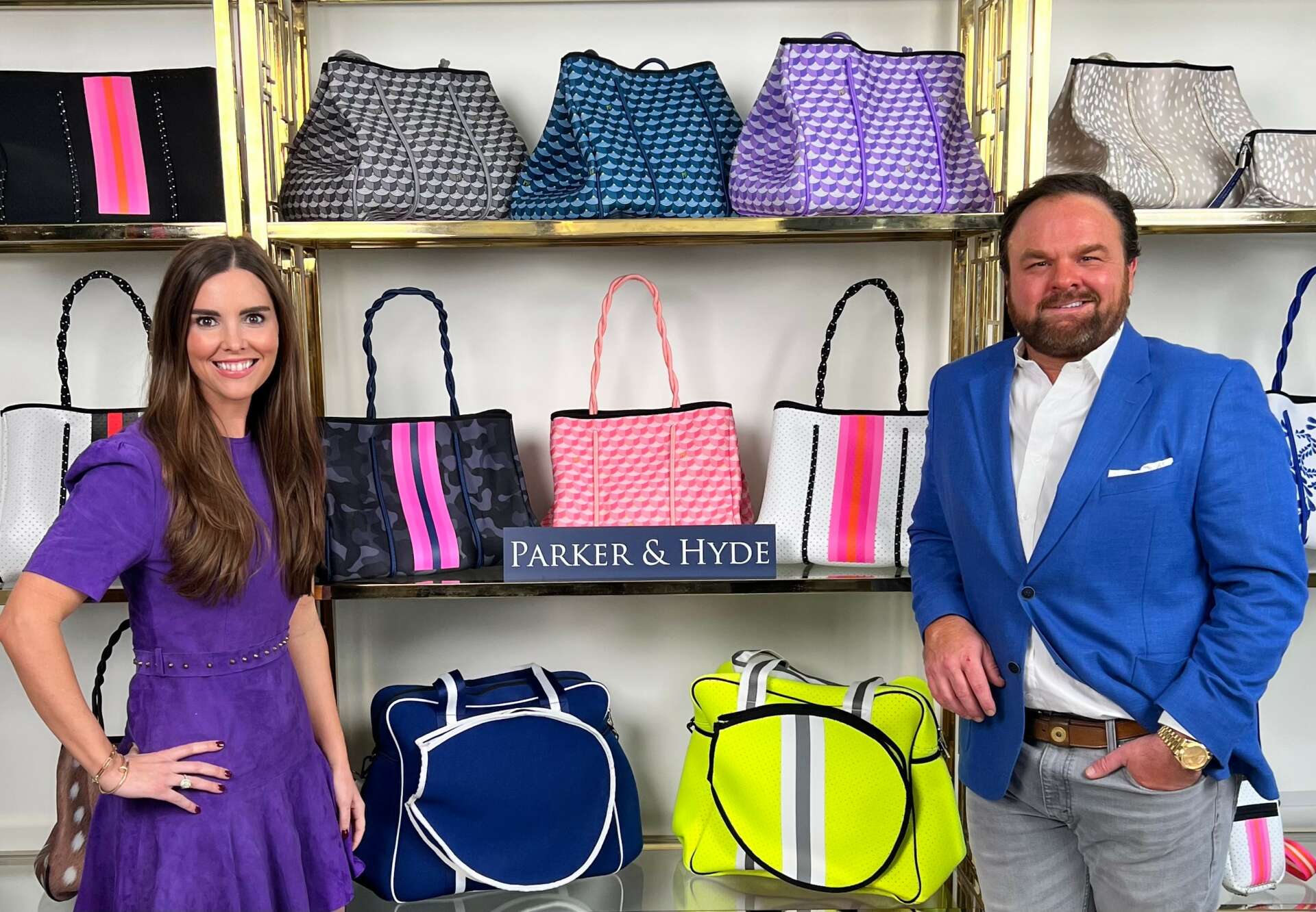 Soon, I was busy working with local designers and clients to choose the right flooring for their spaces, and I realized another love and talent – customizing furniture. As I began to refinish and design furniture, even incorporating the hides from time to time, word of our pieces started to spread and demand grew. It was around this time, now expecting our second child, Lauren began meeting with handbag manufacturers, with an idea to create a cowhide clutch. After seeing the demand for an updated, personalized and unique take on an arguably enduring design piece – the cowhide rug – Lauren felt inspired to translate that notion to something all women love – a fabulous bag! So from the color, to the texture, to the tassel – that is exactly what she designed. Once the first few options were ready to launch, just a few weeks before we were about to welcome our son, Parker, Lauren and I took a risk and officially found ourselves in the business of selling purses. Much like the cowhides, where our “hobby” began, the purses were a hit. Between the hide rugs, furniture, and fashion – we realized that we could no longer call this a hobby- it was a business- and it needed a name. So in honor of our newest family addition, our hobby-turned- business was founded in 2016 and called Parker & Hyde. Now more than 5 years into it, we’ve added on to our family, with the arrival of Preston in 2019, and of course have continued to expand our offerings with the ever-popular, all purpose neoprene tote bag that is continuously updated and is being sold in over 3,000 stores across the country.