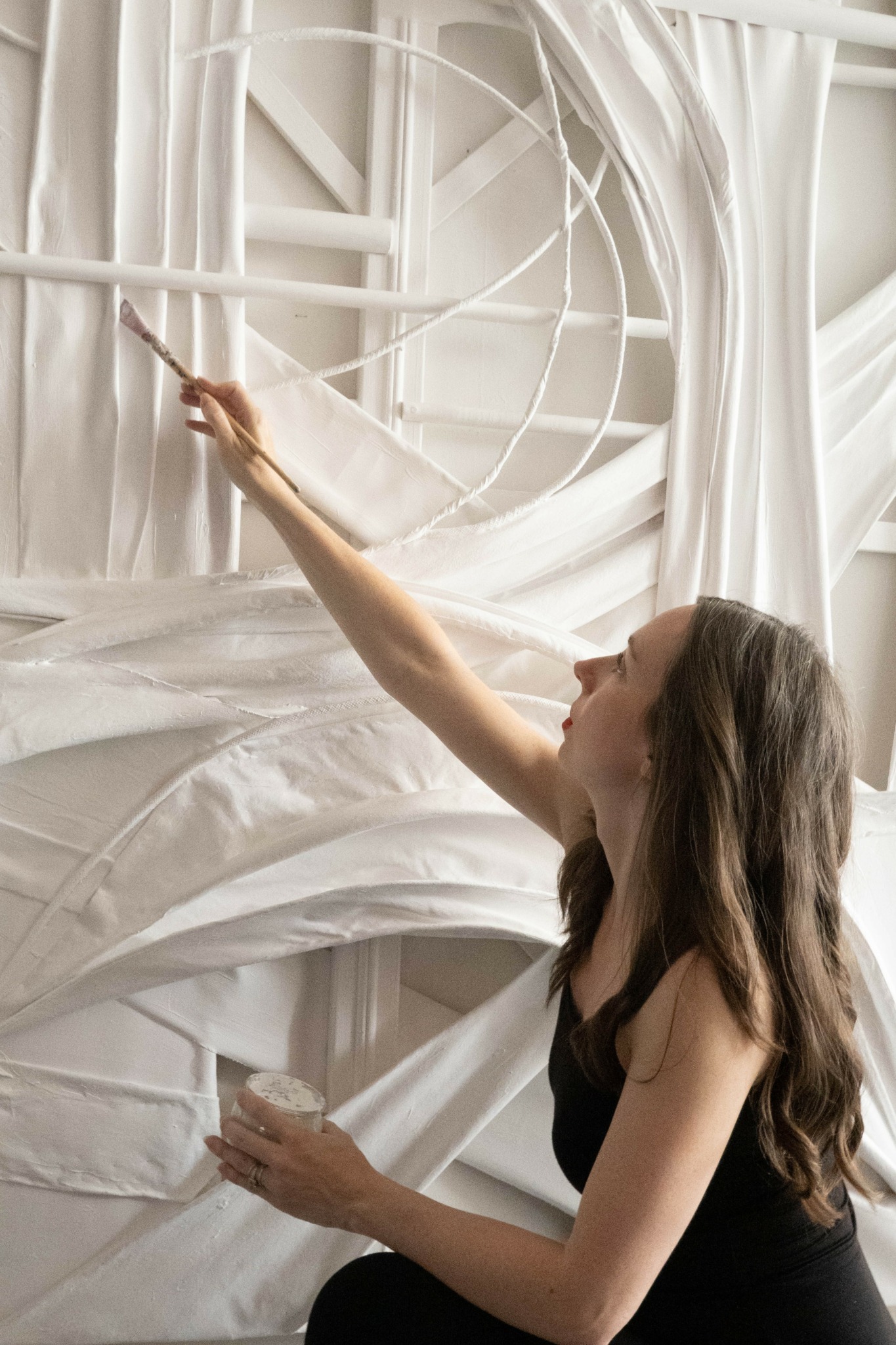 My family has always been very artistic and supportive of my desire to attend art school. After receiving a BFA in textiles at Rhode Island School of Design, I moved to New York, where I worked as a fashion designer for Donna Karan, Ralph Lauren, and Tuleh, further deepening my love of fabric. At that time, my art practice was a personal pursuit, something I did in my spare time. Working in the fashion industry provided me with invaluable organizational skills, professional networks, and an in-depth understanding of textiles–knowledge that later became central to my art. This shift did not happen overnight. A defining moment occurred when I encountered a Barnett Newman painting at MoMA, which inspired me to explore my art practice more seriously. Eventually, I transitioned to freelance work allowing me the flexibility to take open studio classes at the Art Students League. Immersed in an artist community, I found the space to break away from design conventions and embrace a more exploratory approach to my work. This led me to stop using traditional canvases and instead experiment with the fundamental ingredients of painting, deconstructing and reconstructing materials into new forms.