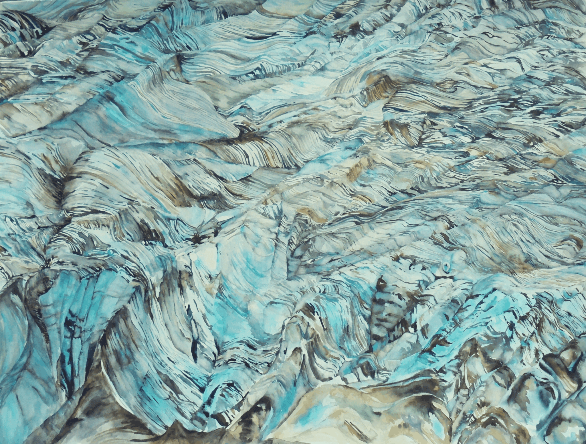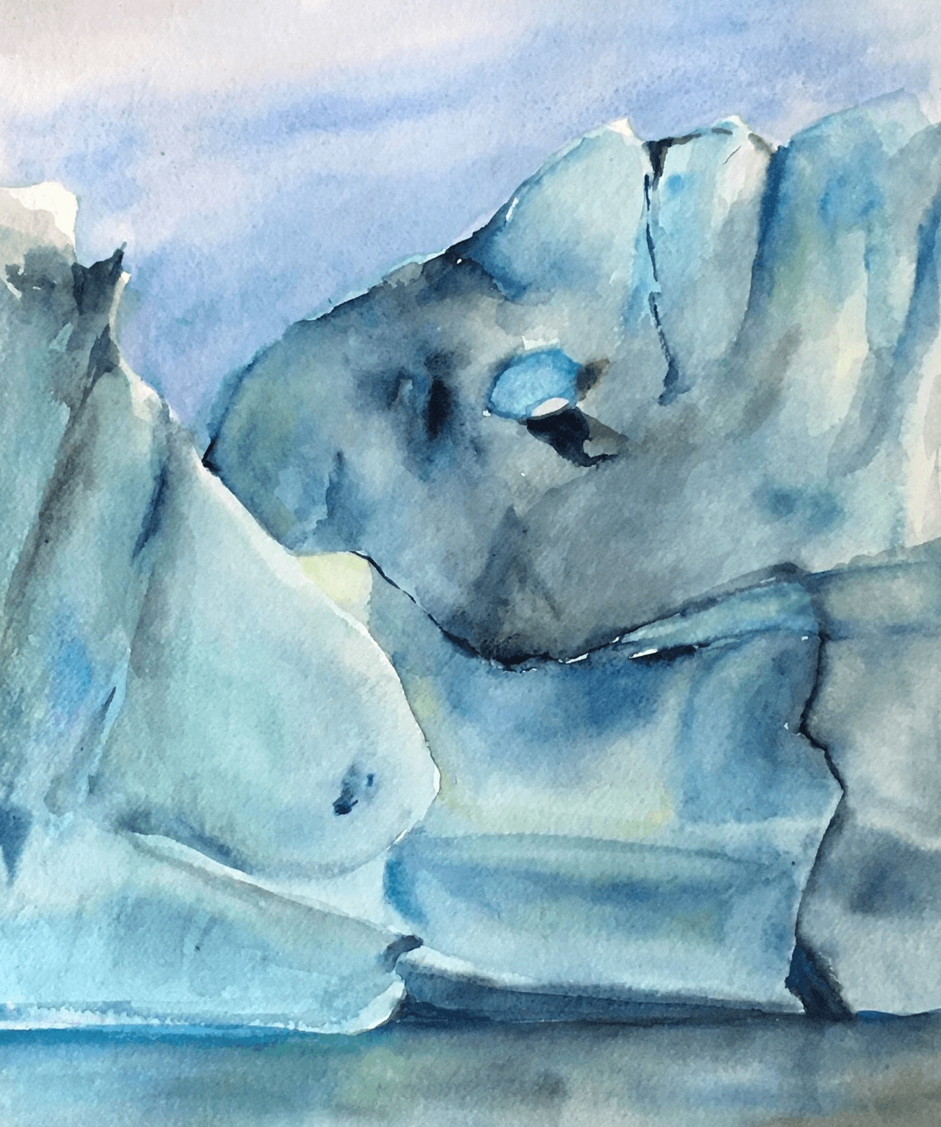 As a watercolorist, I work with the transitory nature of water. Of course, ice melts, but some of my subjects include ice that is thousands of years old. In all of my paintings the background noise of global warming is present, making even superstructures vulnerable. The balance of fragility and strength of frozen worlds mirrors the balance between water and ice.