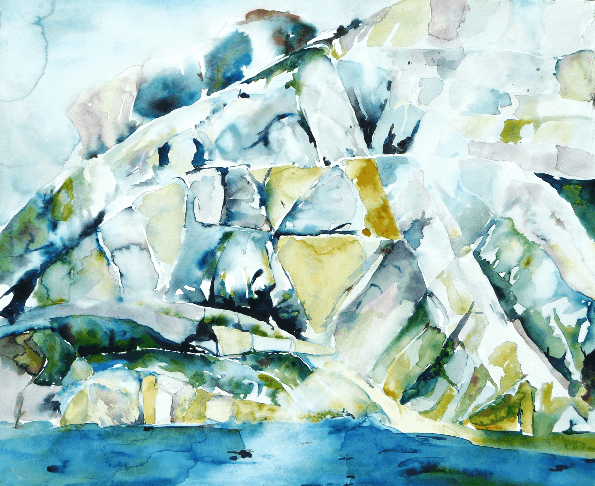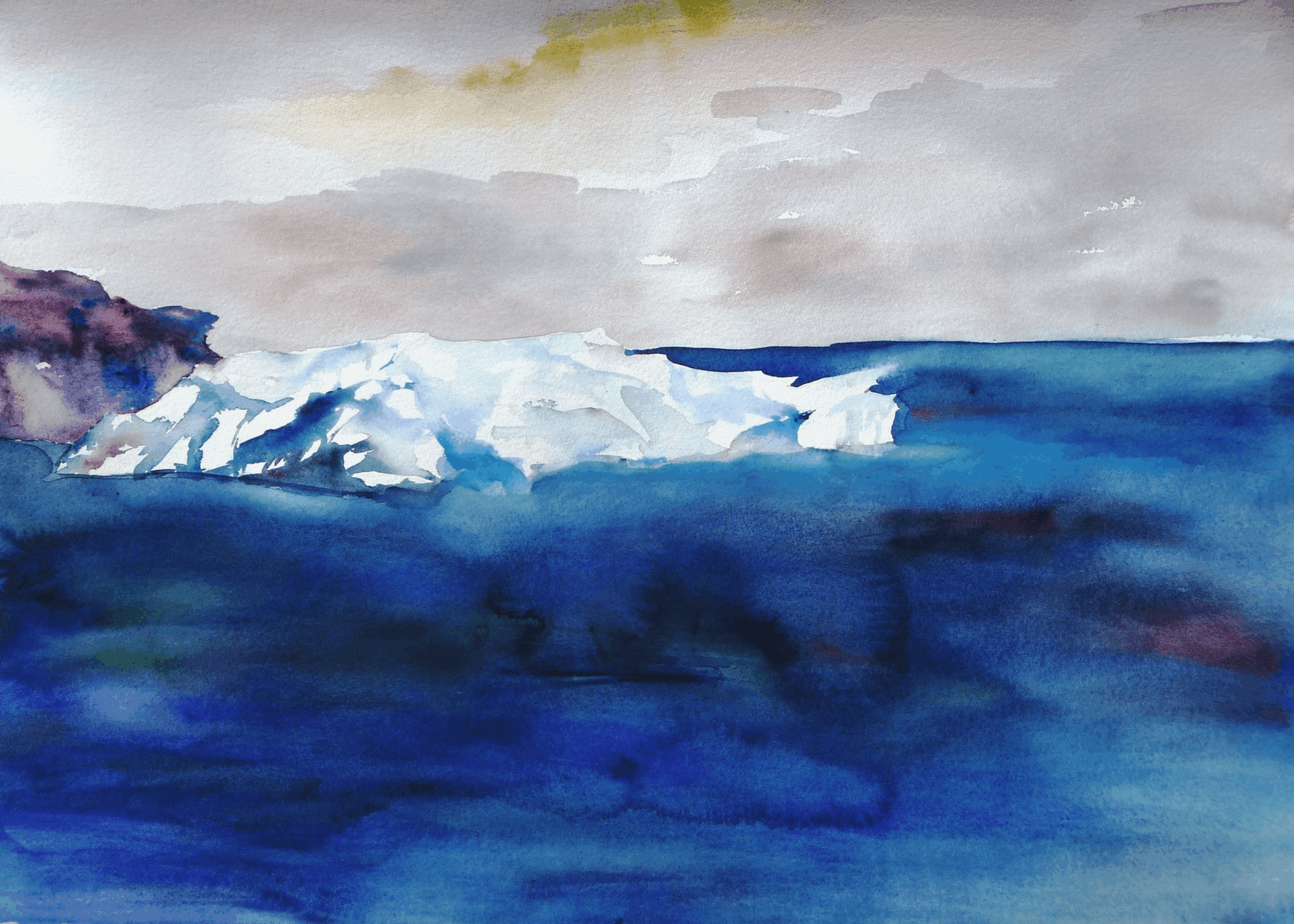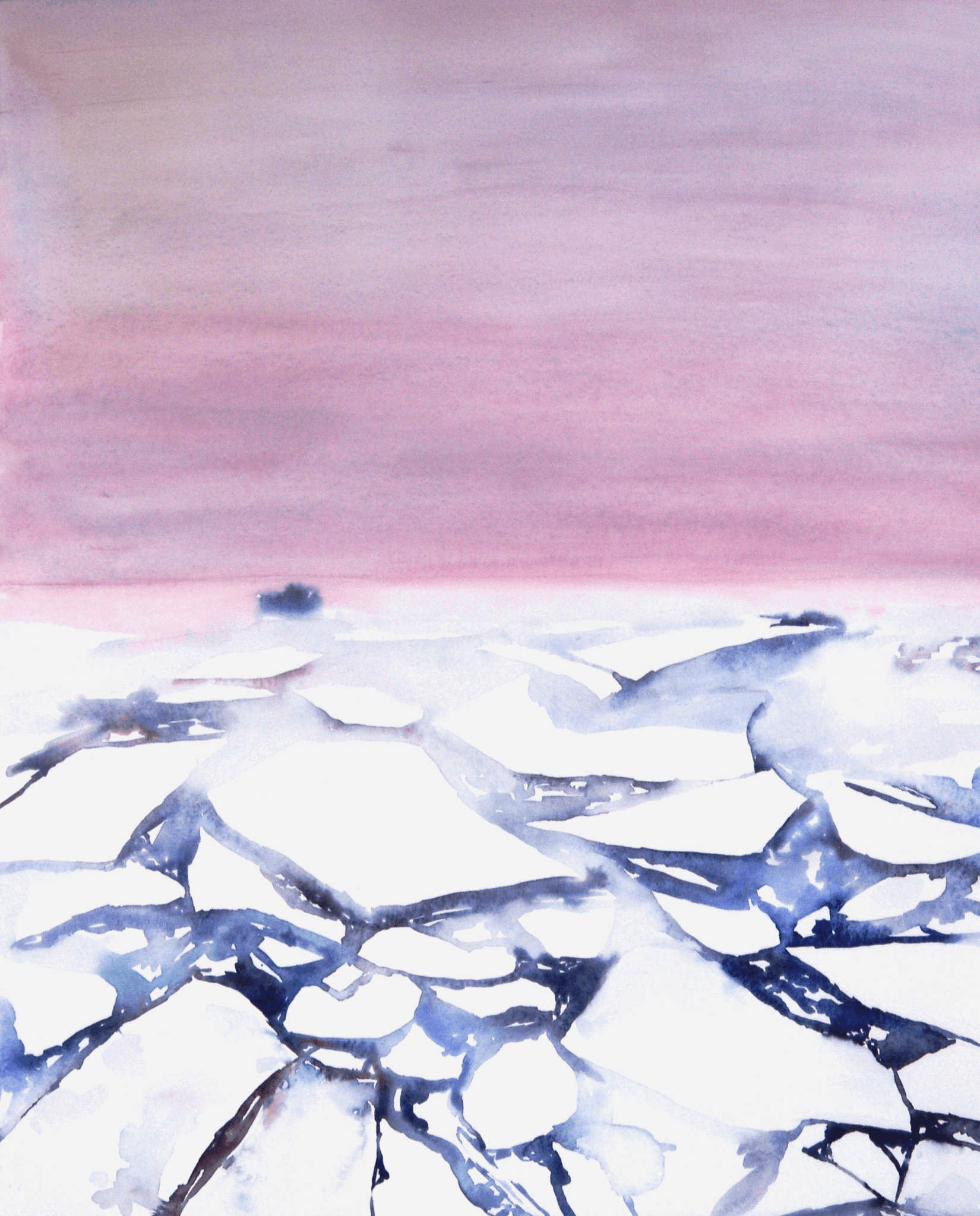 Since that trip, I have travelled to Iceland (multiple times), Alaska, and the High Arctic (near the North Pole). All Polar and frozen landscapes are dominated by an absence that is in stark contrast to the lush landscapes of the rest of the planet. Without the “noise” of animals, people, and plants, the landscape reveals itself as an abstraction of shapes and colors. Every watercolor I paint is an exploration of the absence and the clarity created in these frozen worlds.