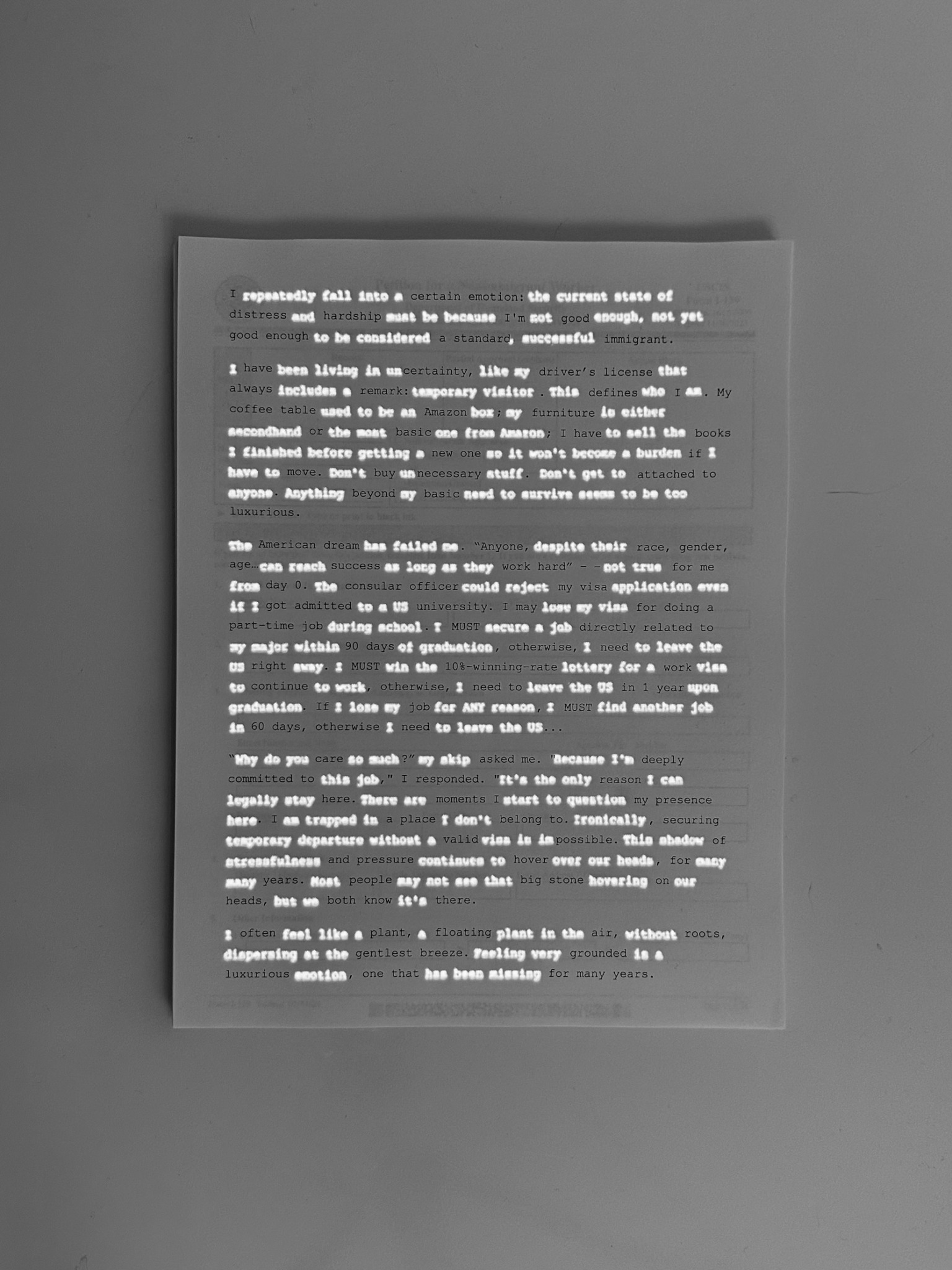 The installation unfolds in two layers. At first glance, visitors see printed stories that seem to honor the American Dream—education, perseverance, success. But crucial words are left blank, creating silence and fragmentation. Read more>>